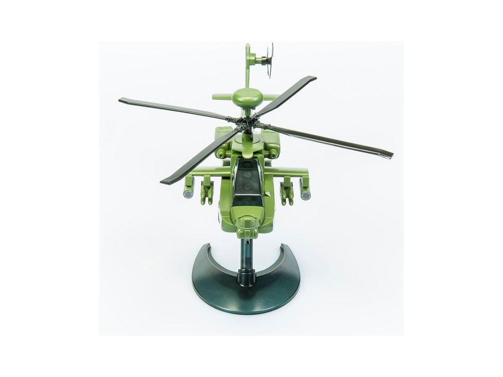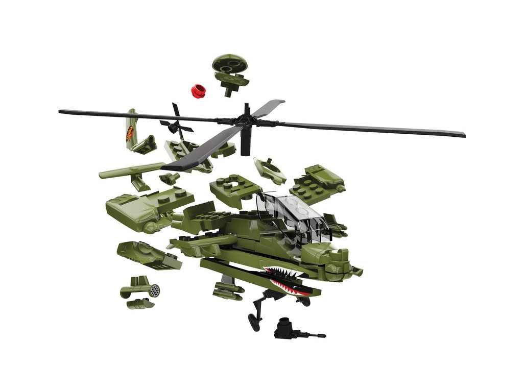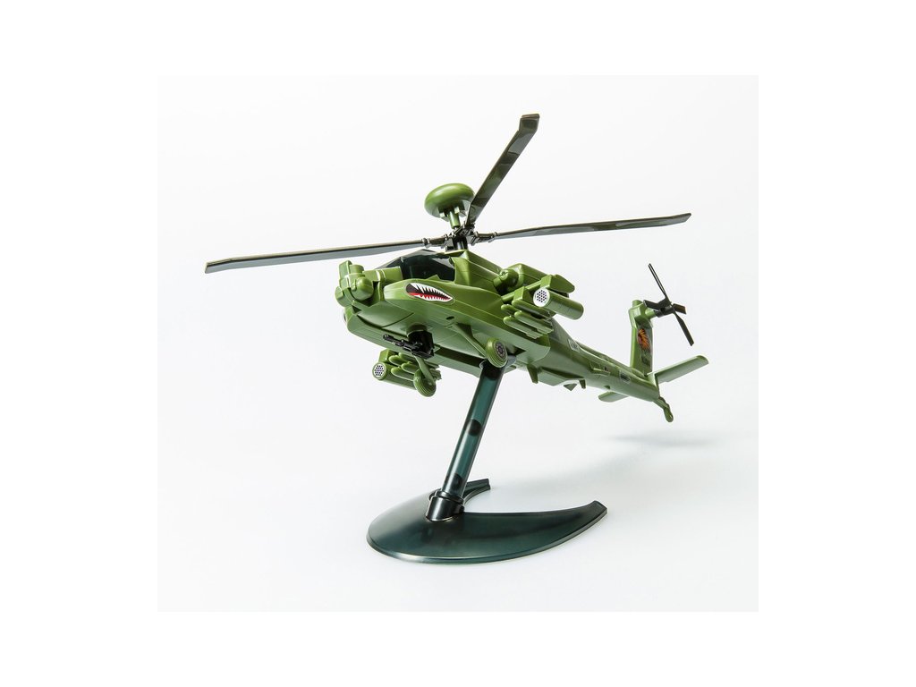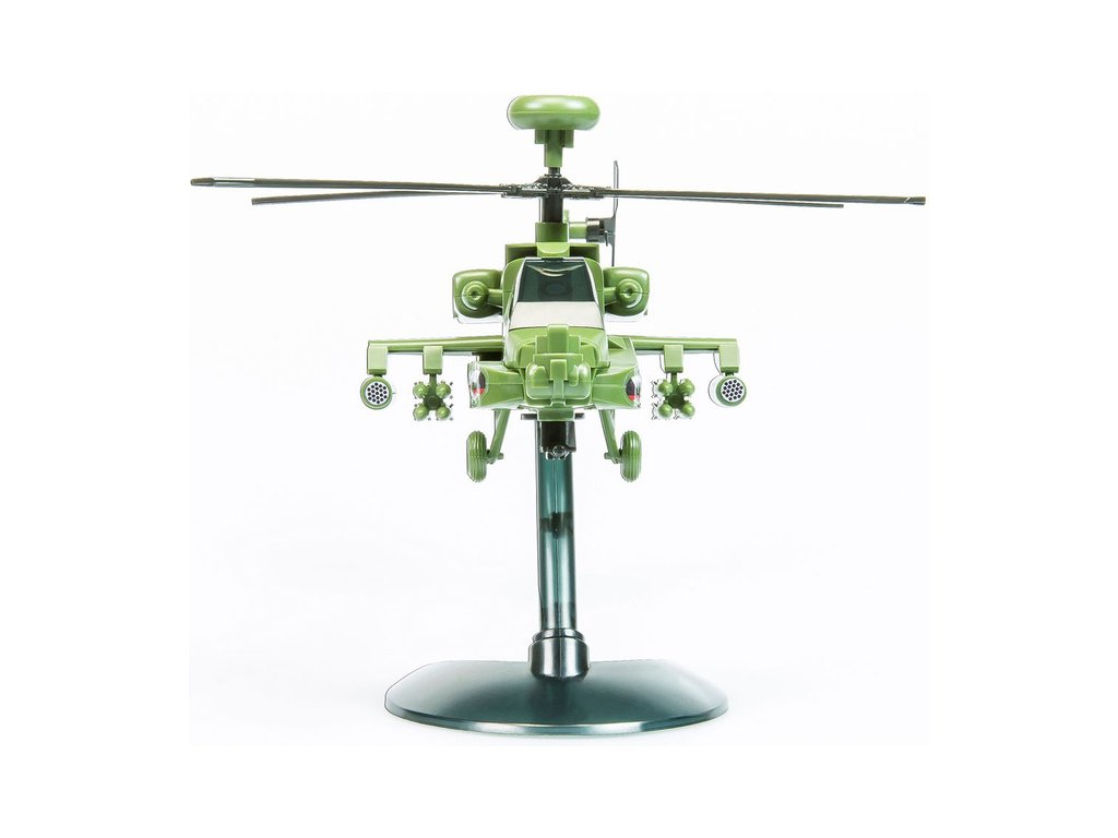Sestavte si svůj vlastní vrtulník Apache! Tento model dvoumotorové útočné helikoptéry se může pochlubit otáčejícím se hlavním i ocasním čtyřlistým rotorem. Jak jinak než v pravé vojenské zelené. Tento kousek má i se stojánkem na výšku 129 mm. Skládá se z celkem 37 částí, stojánek pak z dalších 3.