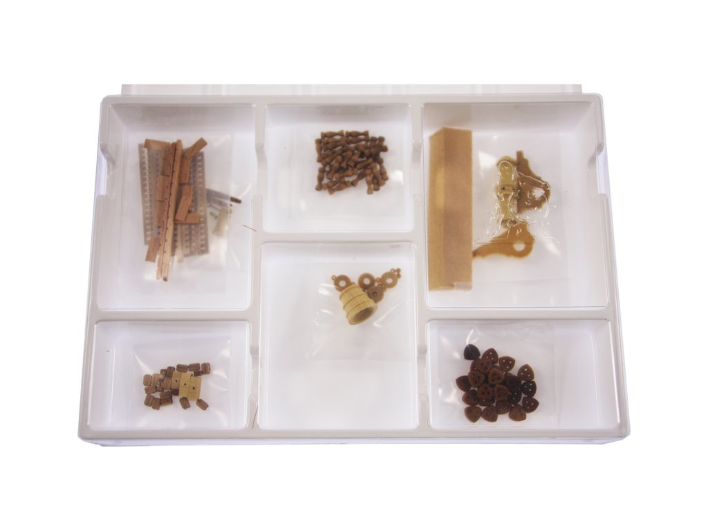 Po otevření víka krabice naleznete dřevěné díly modelu z překližky, sadu lišt, drobné součásti uzavřené v plastovém průhledném blistru, sadu výkresů a manuál.