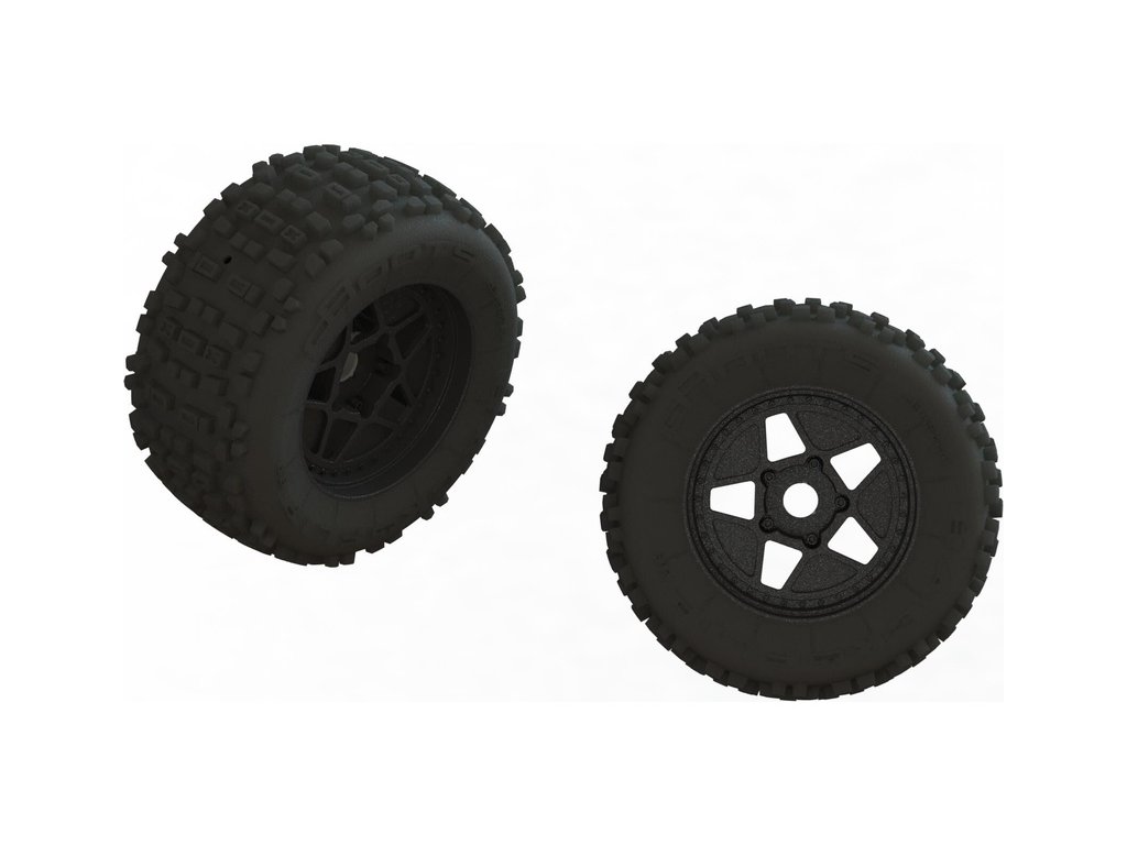 Arrma kola s nalepenými pneumatikami dBoots Back-Flip Big Block MT (2ks v balení). Náhradní kola na auta 1:5 Kraton a Outcast 4X4 8S BLX. Rozměry 214x100mm, disk 125mm 4.9" MT 24mm hex.