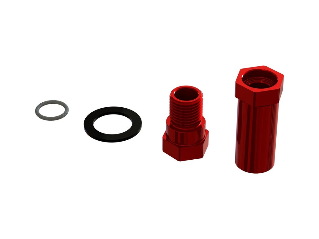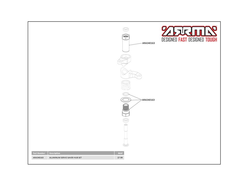 Náboj servo saveru mechaniky řízení s podložkou pod pružinu pro RC auta Arrma. Naboj je vyrobeno z eloxovaného hliníku, podložka pod pružinu je ocelová. K dispozici je i tuningová verze s možností nastavení předpětí pružiny pod objednacím číslem ARAC8905.