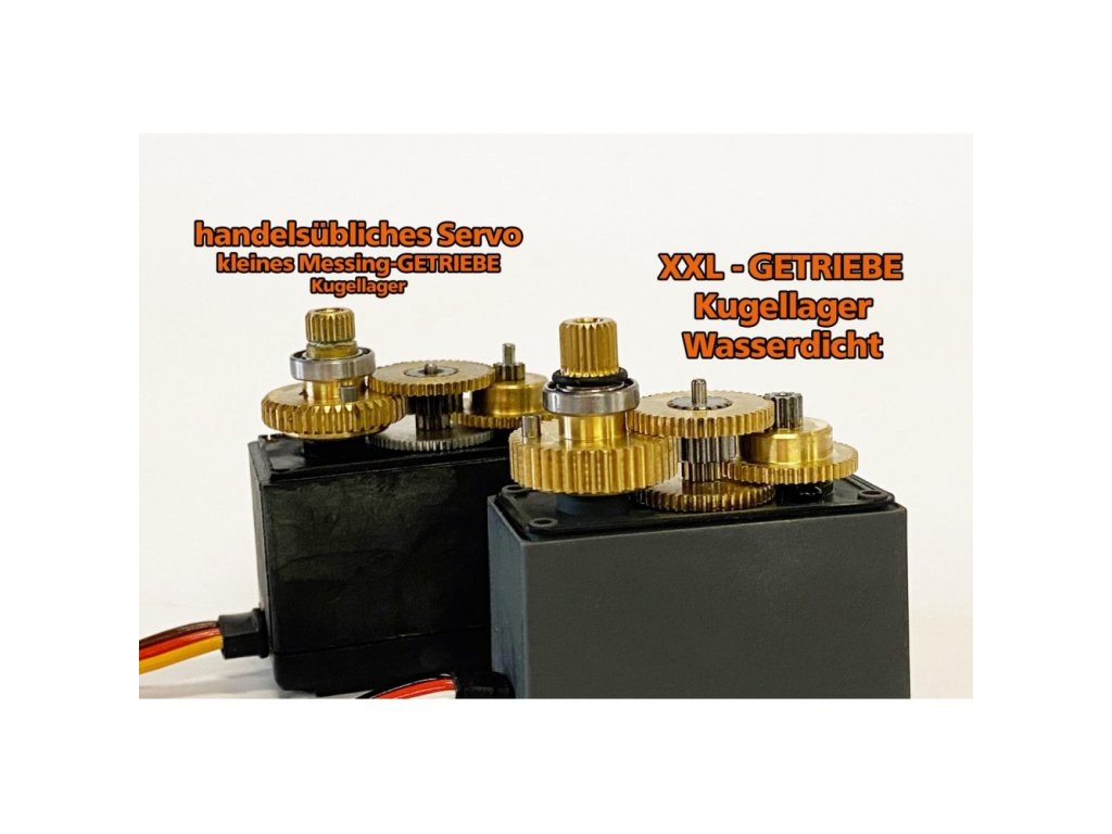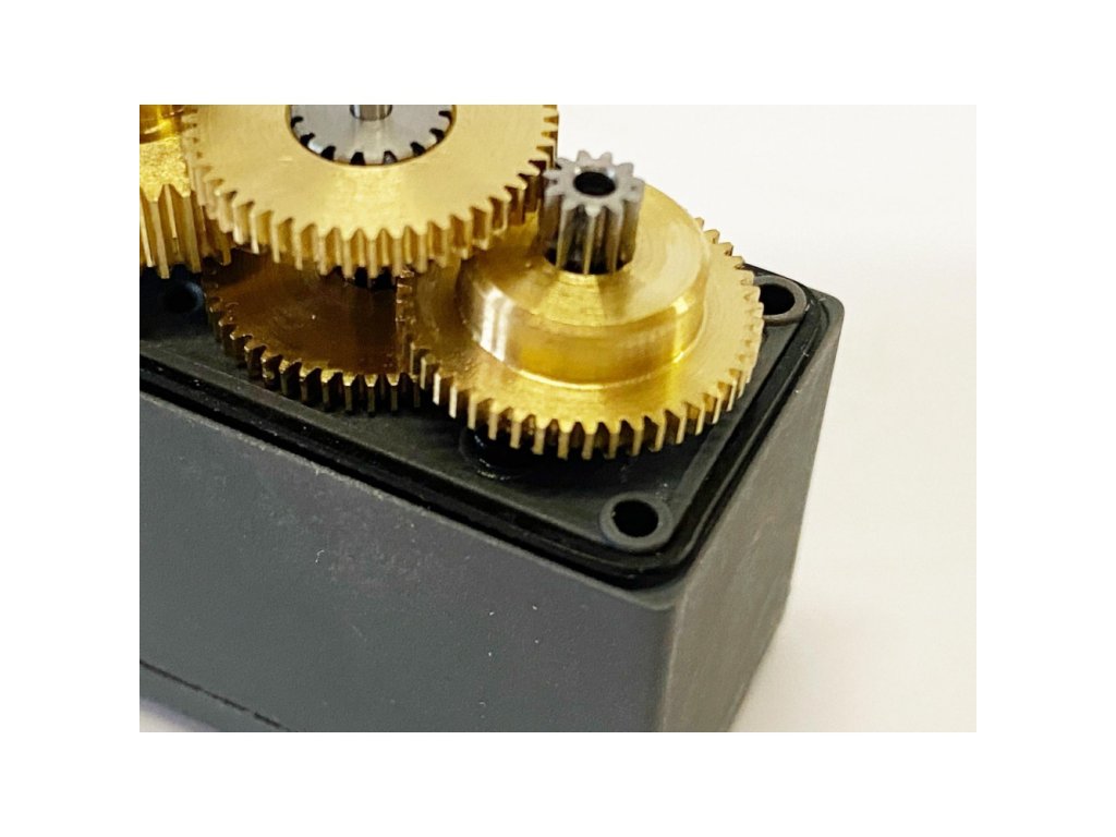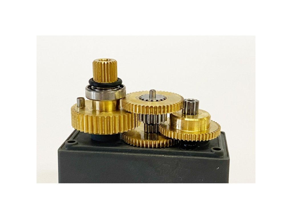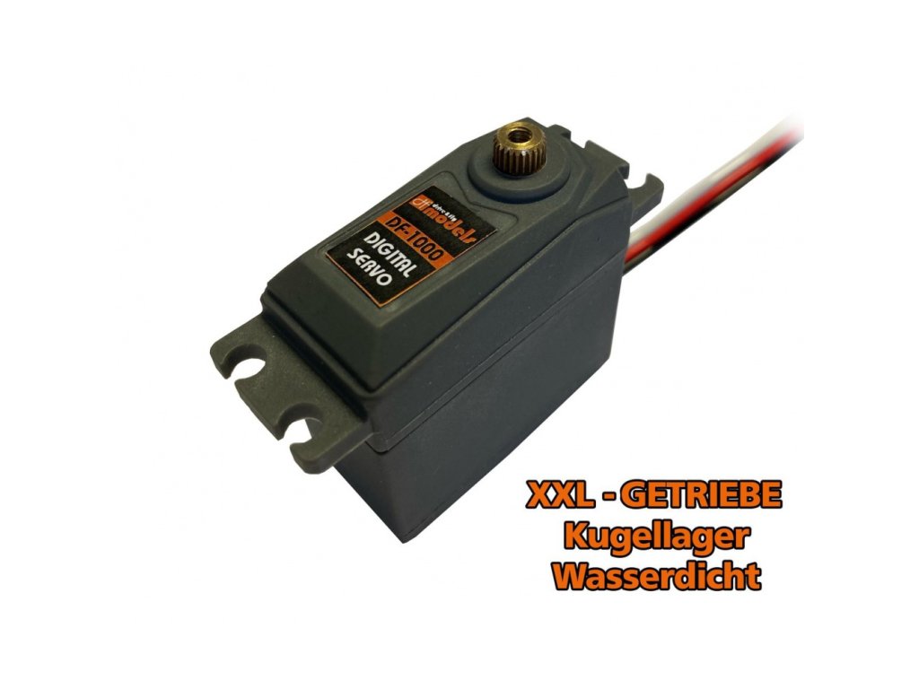 Nové digitální servo DF-1000D od DF Models přesvědčí nejen velkým výkonem. Nová kovová převodovka XXL pravděpodobně překonává všechny dosud existující standardní servopřevodovky. Převody jsou cca o 1/3 - 1/2 větší a stabilnější než standardní serva (této třídy/velikosti). Osy ozubených kol jsou uloženy v kovových pouzdrech, což snižuje opotřebení a zajišťuje vždy přesnou přesnost polohování. Digitální serva mají také kuličková ložiska a jsou vodotěsná.