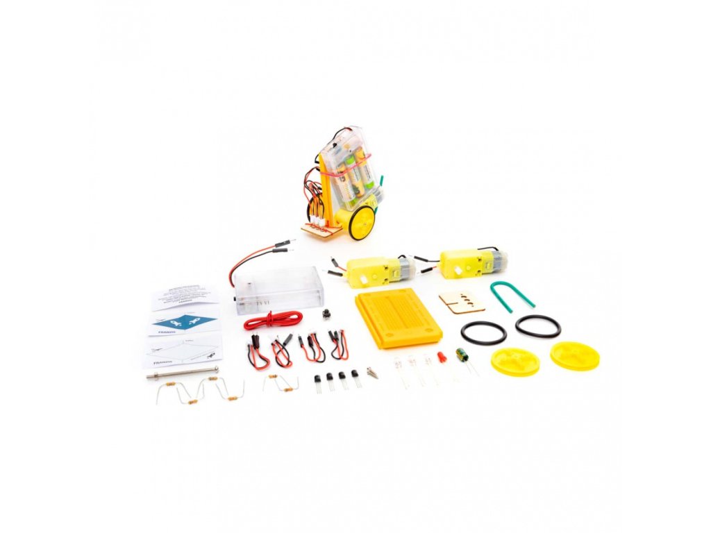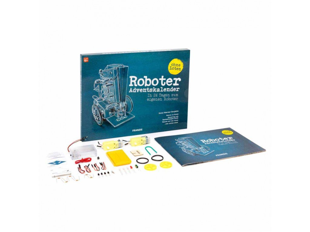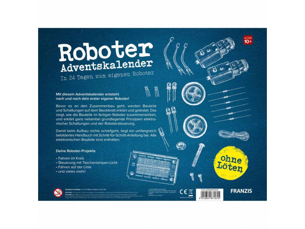 S tímto adventním kalendářem si děti mohou postupně postavit svého vlastního robota – bez jakéhokoli pájení! A 24. prosince budou mít v rukou plně funkčního sledovacího robota, který vás bude houževnatě sledovat. Aby se při montáži nic nepokazilo, je přiložen obsáhlý ilustrovaný návod s pokyny krok za krokem. Robot poslušně jezdí po vyznačené čáře, kterou mi připravíte, či v kruzích a nebo za světlem baterie.