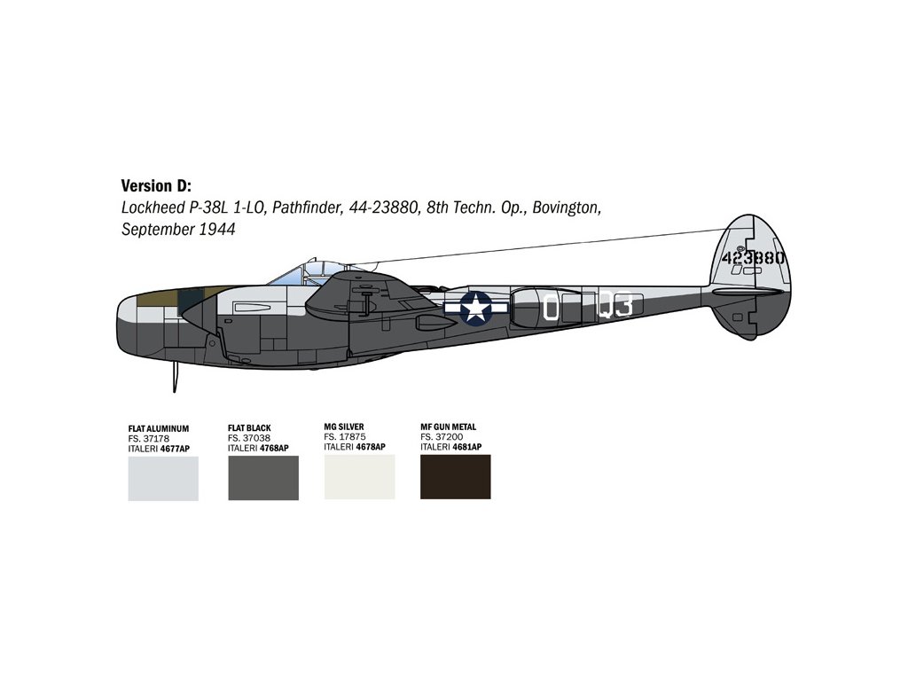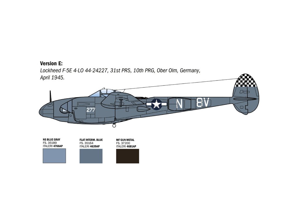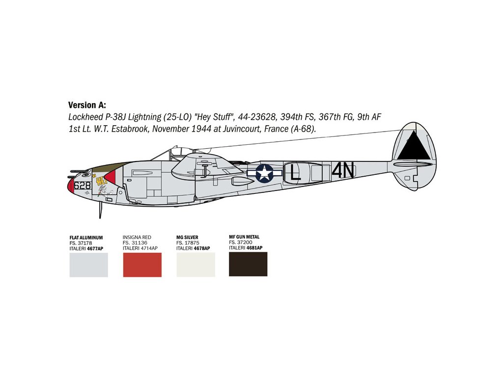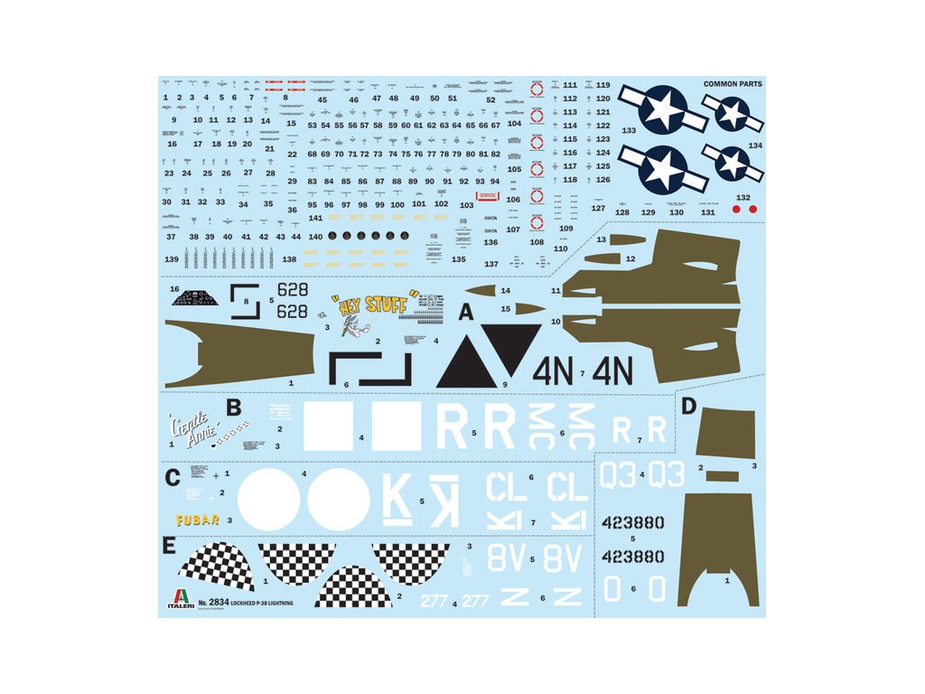 Plastikový model Italeri 2834 - letadlo Lockheed P-38J E.T.O. v měřítku 1:48 ke slepení. Obtížnost 3. Balení obsahuje SKVĚLÉ OBTISKY PRO 5 VERZÍ.