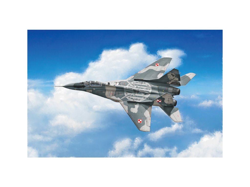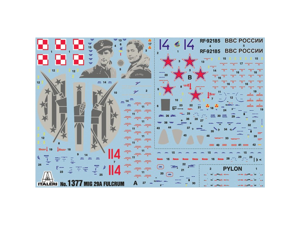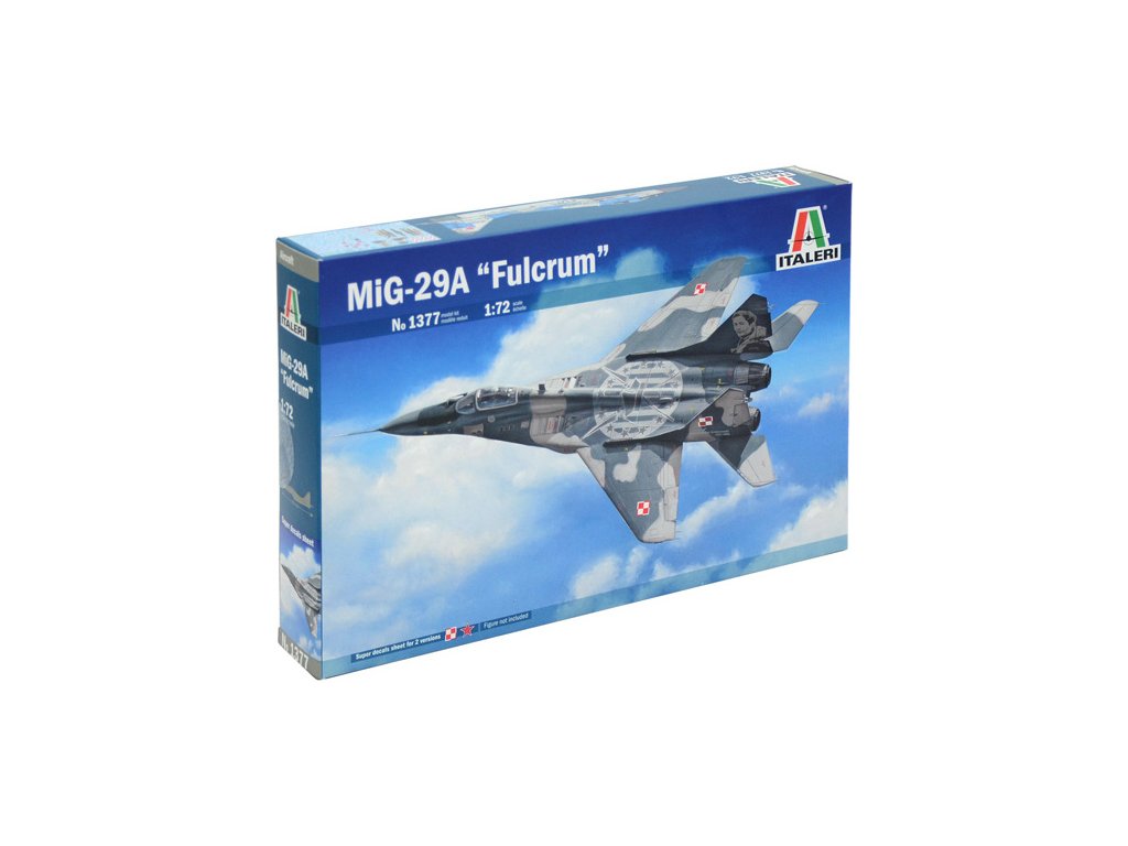 Plastikový model Italeri 1377 - letadlo MIG-29 "Fulcrum" v měřítku 1:72 ke slepení. Délka modelu 236 mm, obtížnost 3. Balení obsahuje SUPER OBTISKY PRO 2 VERZE.