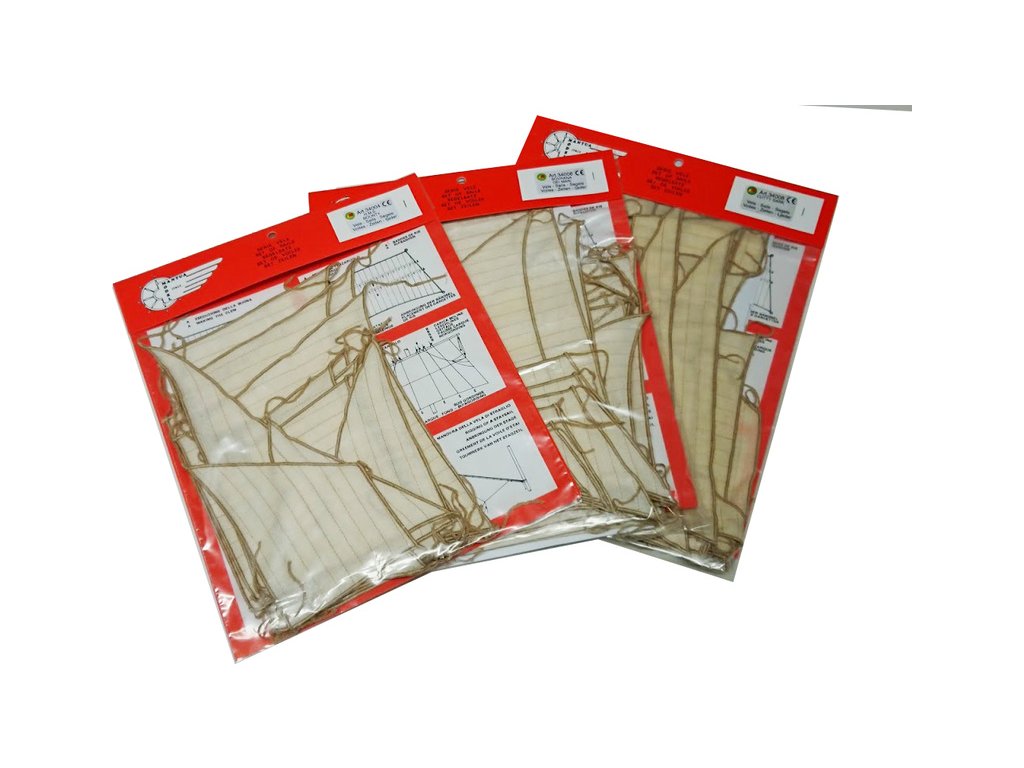 Doporučené příslušenství sada plachet pro stavbu lodi Mantua Model Achilles. Hotová sada plachet je pečlivě šita a lemována. V rozích jsou díly opatřeny delšími kusy plátna pro připevnění. Plachty lze žehlit, k imitaci stáří se doporučuje zředěný černý čaj.