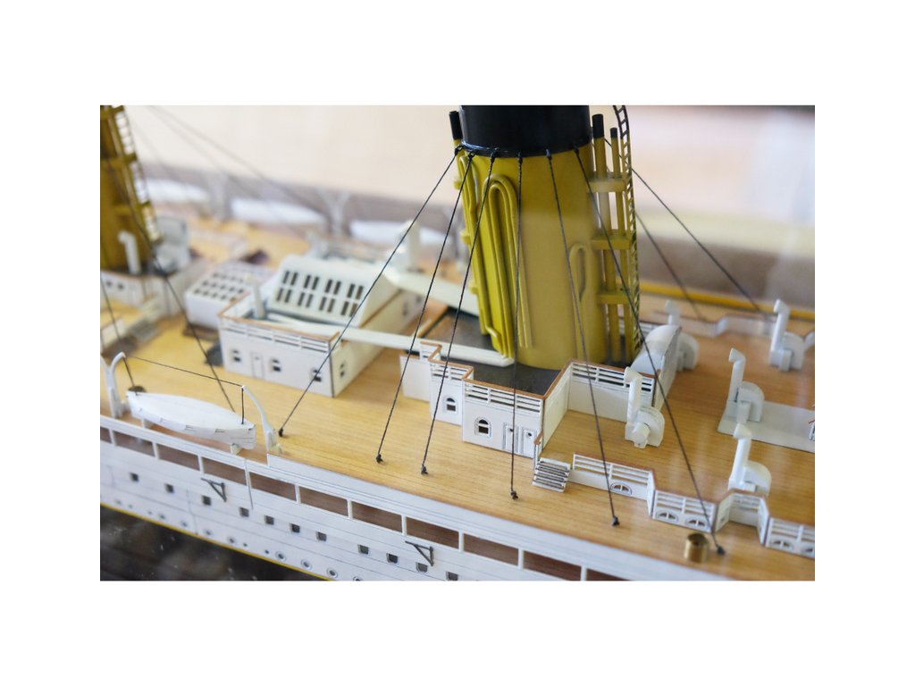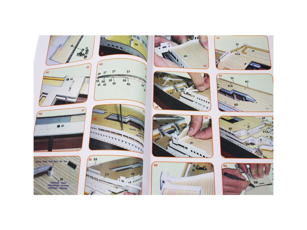 Mantua Model Titanic 1:200 sada č.4 kit v měřítku 1: 200 a délce 1350mm. Titanic je vlajkovou lodí řady Mantua Model. Bylo vybráno měřítko 1: 200 s rozměrem trupu 1350 mm na délku a 140 mm na šířku pro možnost podrobného zpracování detailů. Titanic je dodáván ve dvou verzích statických nebo v provedení RC. Aby modelář mohl stavět postupně, je stavebnice rozčleněna do 5 samostatně prodejných sad. Můžete si zakoupit kompletní sadu nebo jednotlivé sety podle vlastní potřeby. Sada se skládá z 5 částí, z nichž první (KR-800725) je trup a přední a zadní paluba, druhá sada (KR-800726) je balíček motorů pro instalaci funkčního rádiové ovládání, třetí sada (KR-800727) jsou boční panely oken trupu, přídě a zádi, detaily a kování, čtvrtá sada (KR-800728) je střední paluba včetně komínů a pátá (KR-800730) je kompletní sada kování. Konstrukce je obecně z přepážek na kýlu s laserem řezanými a leptanými dřevěnými detaily. Součástí je anglický návod a foto detaily.