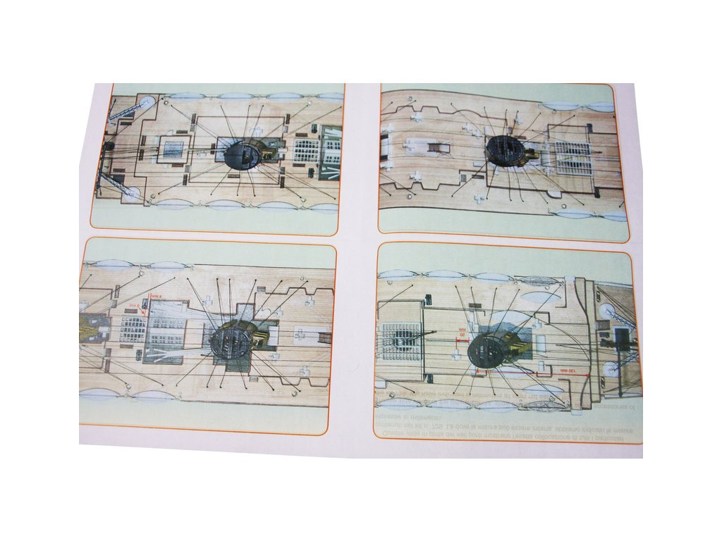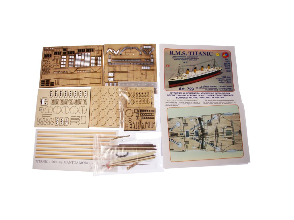 Mantua Model Titanic 1:200 sada č.5 kit v měřítku 1: 200 a délce 1350mm. Titanic je vlajkovou lodí řady Mantua Model. Bylo vybráno měřítko 1: 200 s rozměrem trupu 1350 mm na délku a 140 mm na šířku pro možnost podrobného zpracování detailů. Titanic je dodáván ve dvou verzích statických nebo v provedení RC. Aby modelář mohl stavět postupně, je stavebnice rozčleněna do 5 samostatně prodejných sad. Můžete si zakoupit kompletní sadu nebo jednotlivé sety podle vlastní potřeby. Sada se skládá z 5 částí, z nichž první (KR-800725) je trup a přední a zadní paluba, druhá sada (KR-800726) je balíček motorů pro instalaci funkčního rádiové ovládání, třetí sada (KR-800727) jsou boční panely oken trupu, přídě a zádi, detaily a kování, čtvrtá sada (KR-800728) je střední paluba včetně komínů a pátá (KR-800730) jsou součásti k dokončení palub a nástaveb, sada kování.. Konstrukce je obecně z přepážek na kýlu s laserem řezanými a leptanými dřevěnými detaily. Součástí je anglický návod a foto detaily.