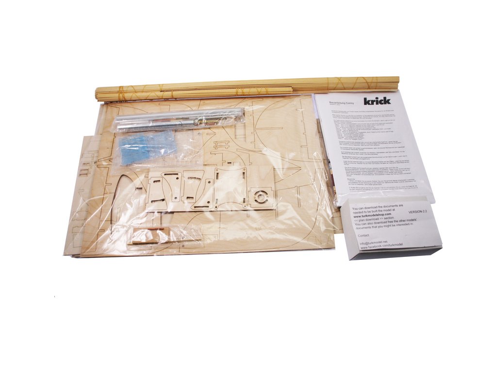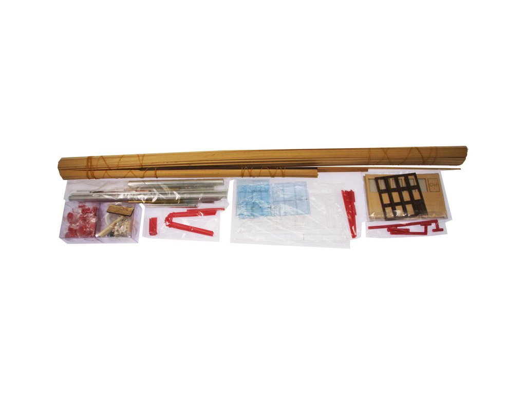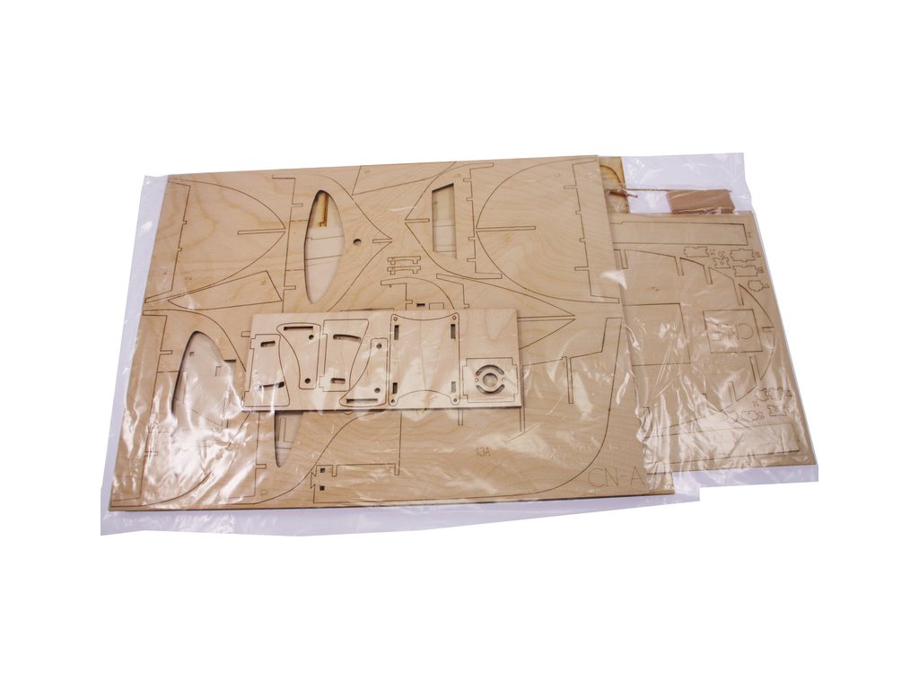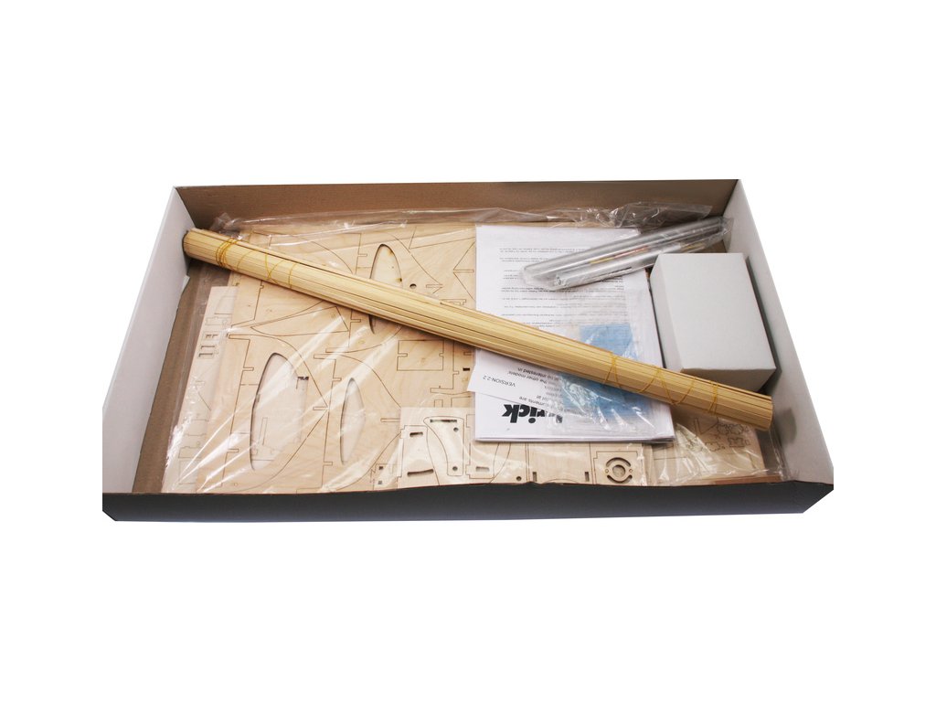 Po otevření víka krabice naleznete dřevěné díly modelu z překližky, sadu lišt, drobné součásti uzavřené v sáčcích, sadu výkresů a manuál.