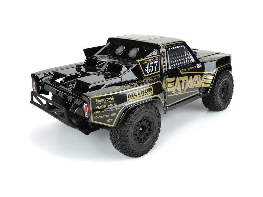 černá karoserie Ford® F-100 Race Truck Heatwave® v edici z roku 1967 pro Short Course. Nyní si můžete postavit plně licencovanou repliku oblíbeného plnohodnotného Heatwave® Trophy Truck řízeného Chrisem Isenhouerem! Chris závodí na svém ikonickém Black and Gold Heatwave® Ford® F-100 převedeném na specifikace Trophy Truck v neúprosné poušti spolu se svým bratrem Nickem. Pro-Line je hrdý na to, že může oživit Chrisův náklaďák pro váš Short Course, který je vyroben z odolného černého polykarbonátu! Black and Gold Heatwave® obtiskový obal je součástí balení a předem nařezaný pro snadnou instalaci.