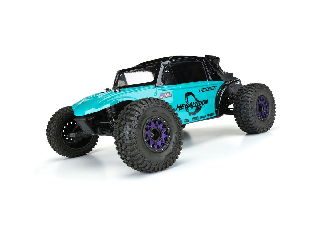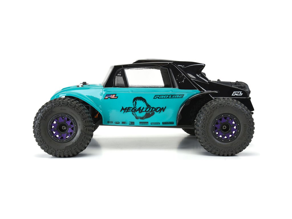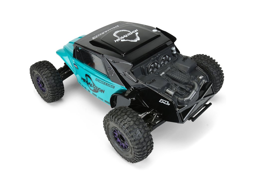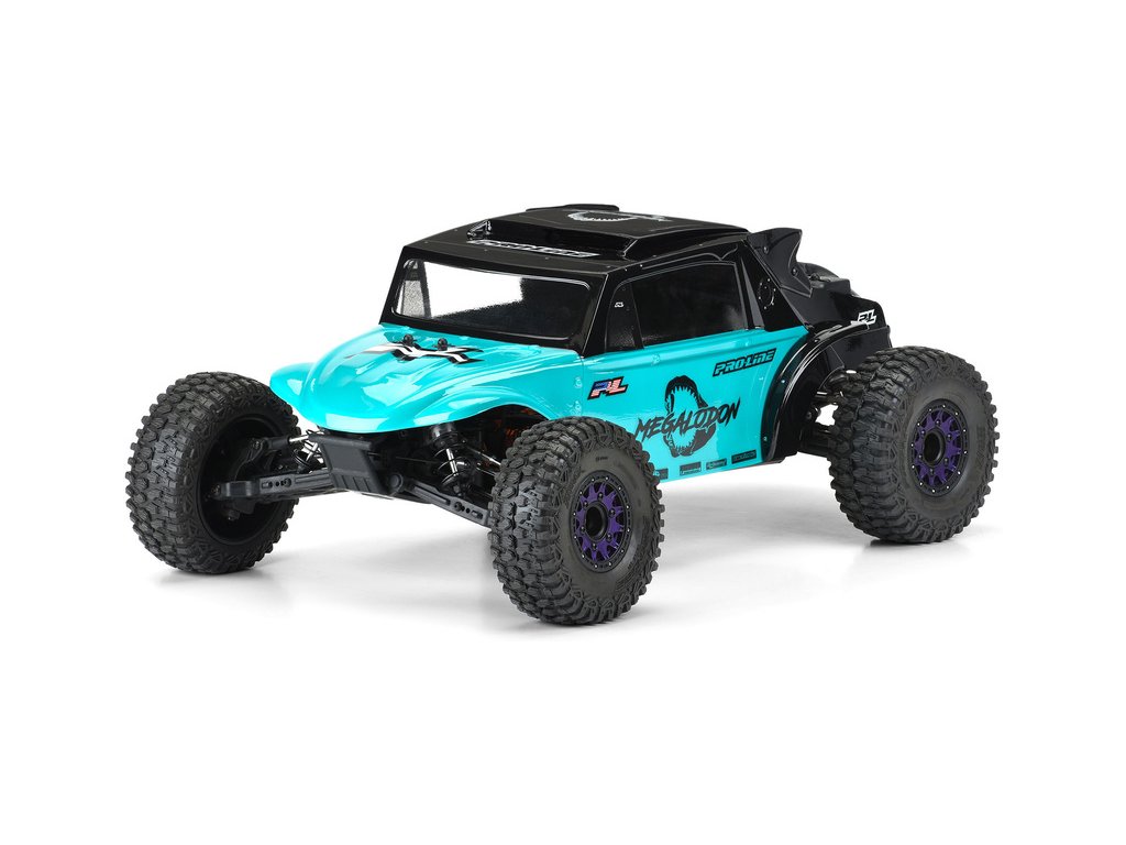 Karoséérie Pro-Line Megalodon Desert Buggy. Transformujte vzhled svého Slash® 2wd nebo Slash® 4x4 na Megalodon Desert Buggy! Ztvárněny jsou všechny detaily této buggy, včetně tvarovaných detailů motoru, střešního nasávacího otvoru, přídavných zadních blatníků a bočních blatníků. Chcete-li vytvořit největší možný Megalodon, doporučujeme použít pneumatiky Hyrax SCXL 2,2"/3,0" pro tento zabijácký nadměrný vzhled. Karosérie je čirá, takže si můžete upravit vzhled a nalakovat si ji, jak chcete!