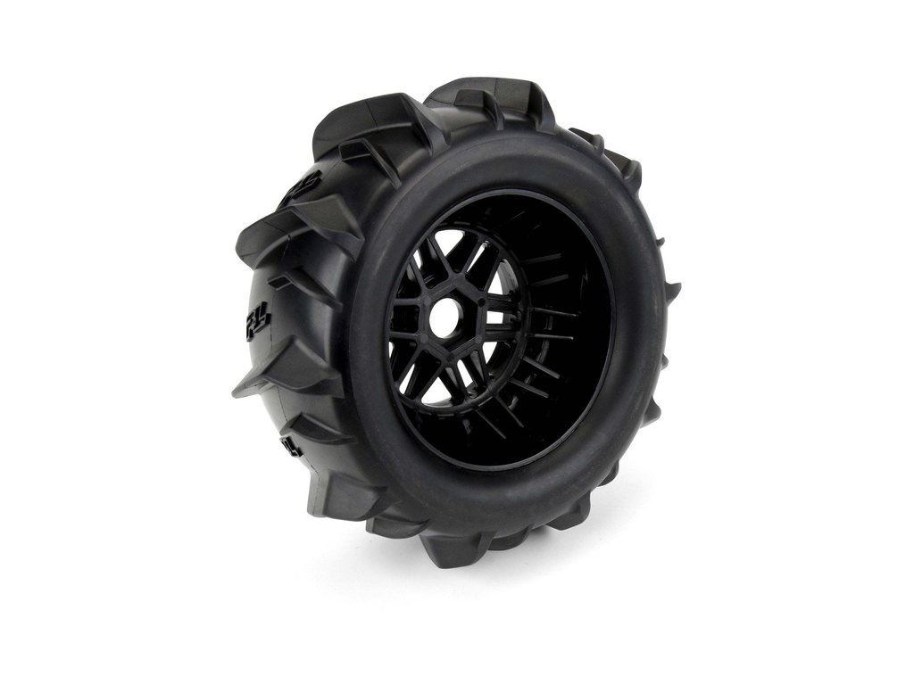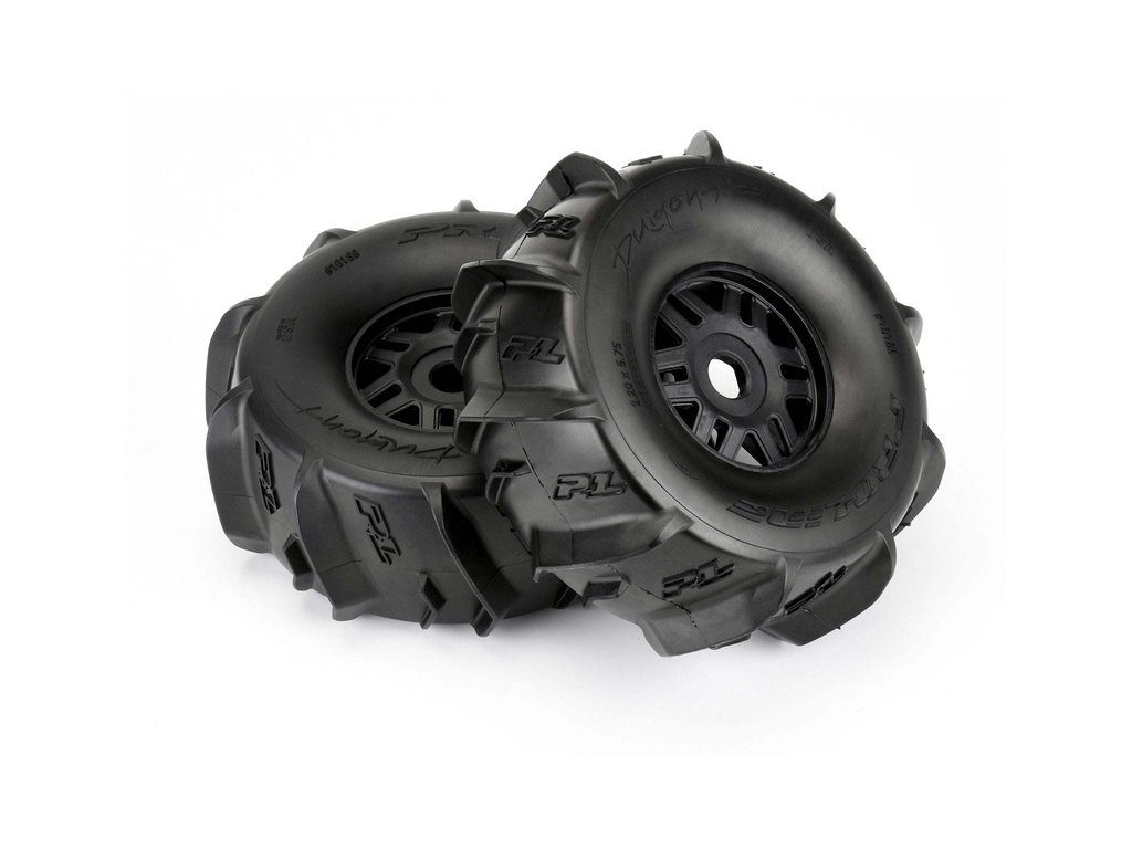 Kompletní kola Pro-Line pro RC modely aut 1:7. Rozměr ⌀146x56 mm. Disk má černou barvu. Pádlové pneumatiky Dumont 2.4/3.3, tvrdost směsi M2 (střední). Unašeč je šestihran 17 mm.