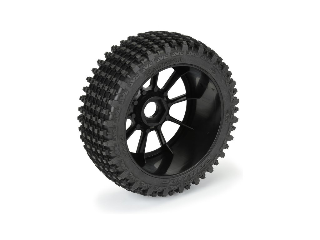 Kompletní kola Pro-Line pro RC modely aut 1:8. Rozměr ⌀114x44 mm. Disk Mach 10 má černou barvu. Pneumatiky Gladiator 3.3", tvrdost směsi M2 (střední). Vložka Closed Cell. Unašeč je šestihran 17 mm.