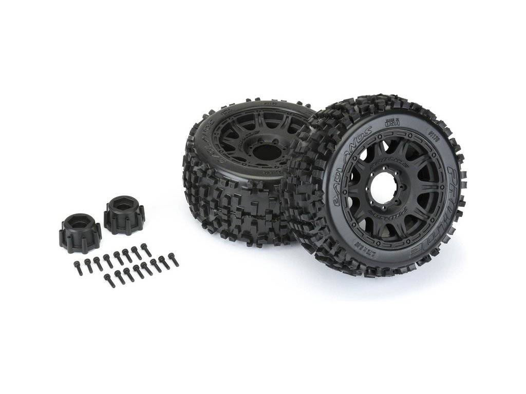 Kompletní kola Pro-Line pro RC modely aut 1:8. Rozměr ⌀149x72 mm. Disk Raid má černou barvu. Pneumatiky Badlands 3.8" MT, tvrdost směsi M2 (střední). Unašeč je šestihran 17 mm.
