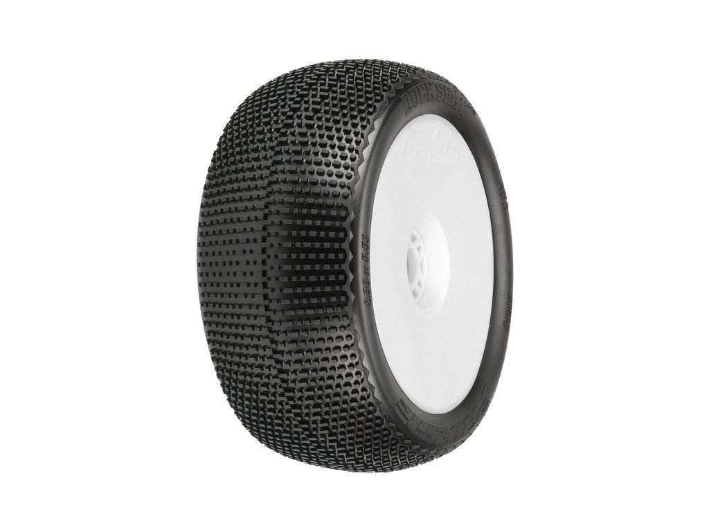 Kompletní kola Pro-Line pro RC modely aut 1:8. Rozměr ⌀140x60 mm. Disk Velocity má bílou barvu. Pneumatiky Buck Shot Buggy 4.0", tvrdost směsi S3 (měkká). Unašeč je šestihran 17 mm. Vložka Closed Cell.