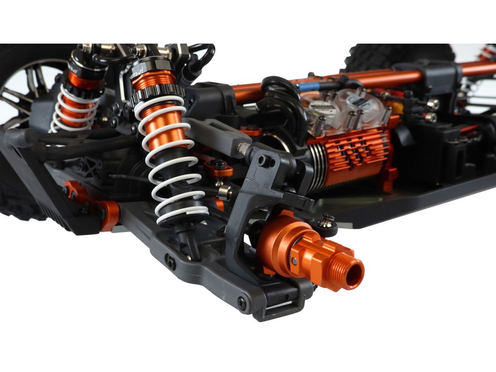Aby nedocházelo k přehřívání, je motor i střídavý regulátor 150A vybaven ventilátory. Mechanický brzdový systém modelu je ovládán 15kg kovovým převodovým servomotorem a lze jej použít jako doplněk k elektrické brzdě ovladače pro dosažení dokonalých úhlů driftu. Masivní olejové tlumiče v kombinaci s plně nastavitelným podvozkem zajišťují vynikající vyvážení a optimální přilnavost díky speciálně vyvinutým 165mm pneumatikám.