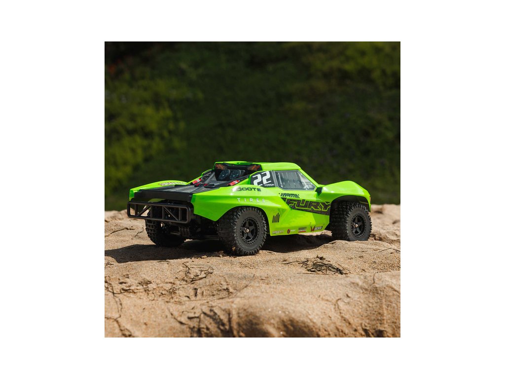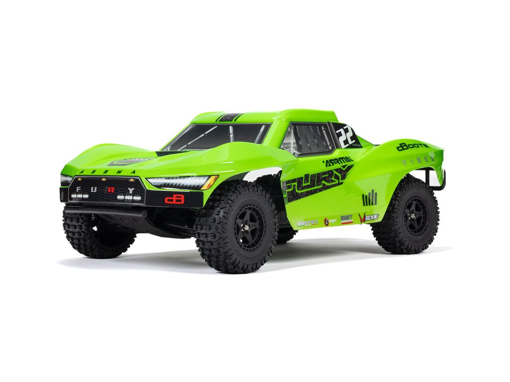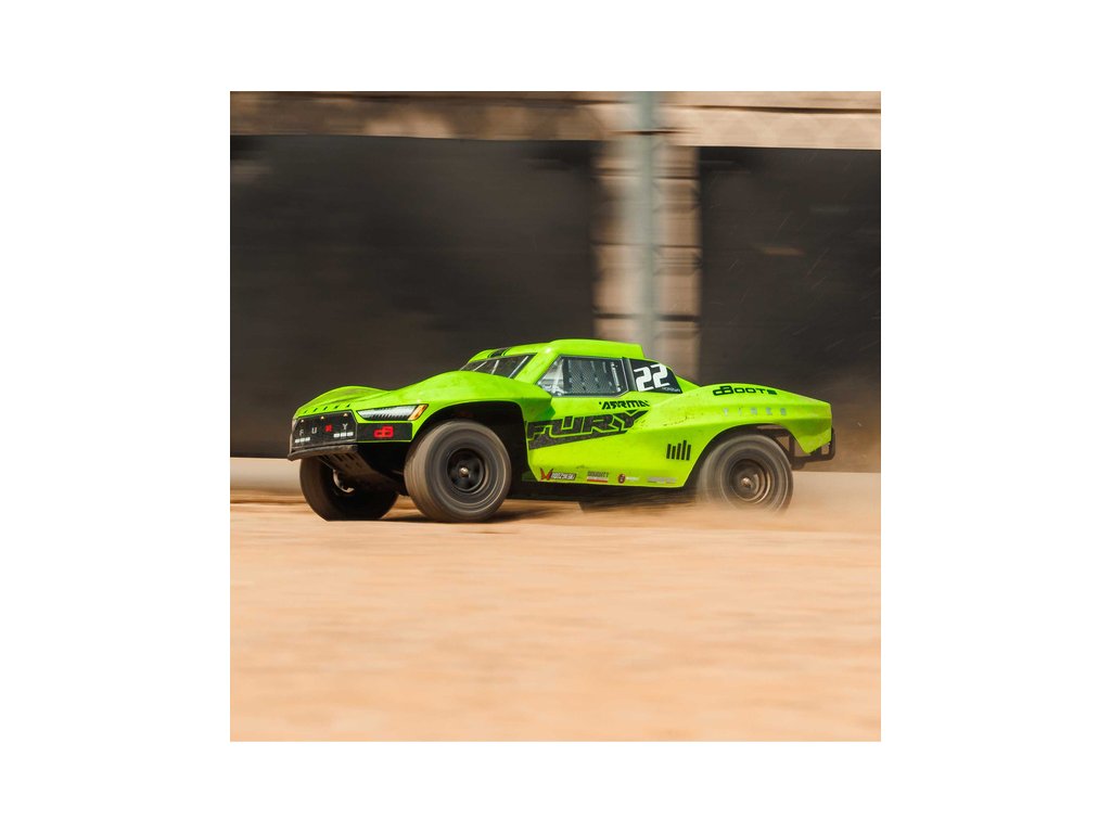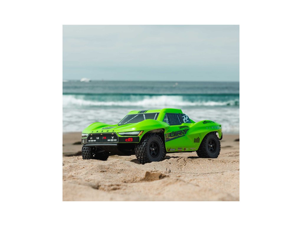 RC model Arrma Fury Mega 550 1:10 RTR Basic je cenově dostupné auto na dálkové ovládání typu Short Course s náhonem 2WD, nezávislým zavěšením, olejovými tlumiči, proporcionálním řízením a stejnosměrným motorem. RC souprava SLT 2.4 GHz.