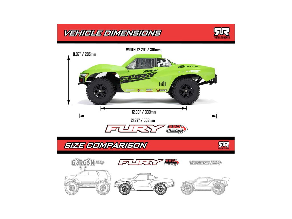 RC model auta Arrma Fury Mega 550 1:10 RTR typu Short Course s náhonem 2WD, nezávislým zavěšením, olejovými tlumiči, proporcionálním řízením a stejnosměrným motorem. Jako jeden z cenově nejdostupnějších RC aut v měřítku 1:10 zaujme především začínající řidiče a děti. Díky plnohodnotné výbavě je však vhodný i pro zkušenější jezdce. Model zachovává všechny přednosti modelů značky Arrma jako je odolnost, vysoký výkon a podpora dílů.