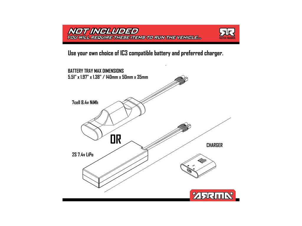 Pro běžné ježdění a pro děti doporučujeme dokoupit NiMH akumulátor 8.4V (vysoký). Pro lepší akceleraci a delší dobu jízdy doporučujeme 2S LiPo akumulátor s konektorem IC3 nebo EC3.