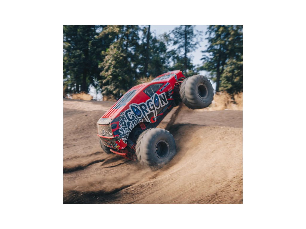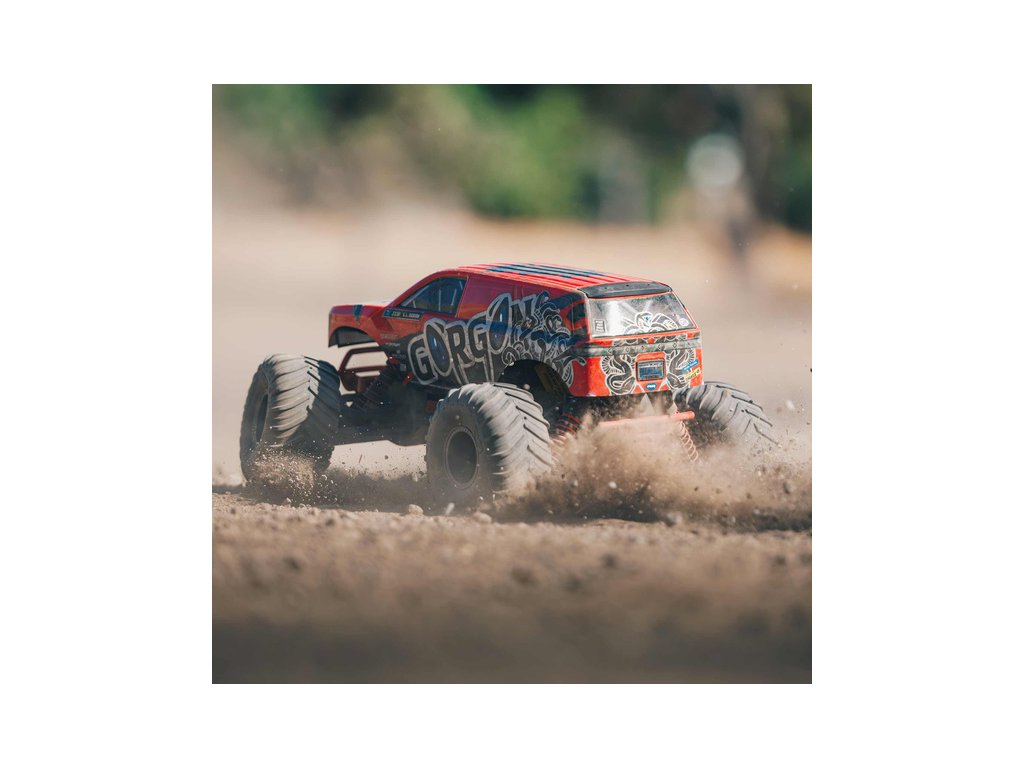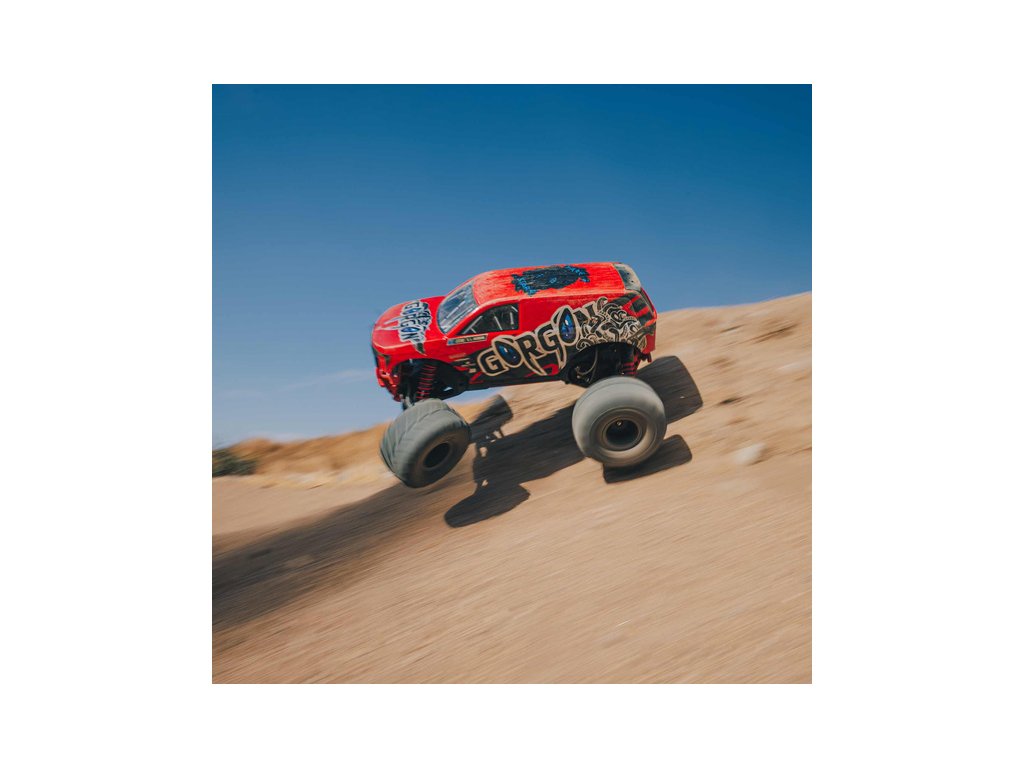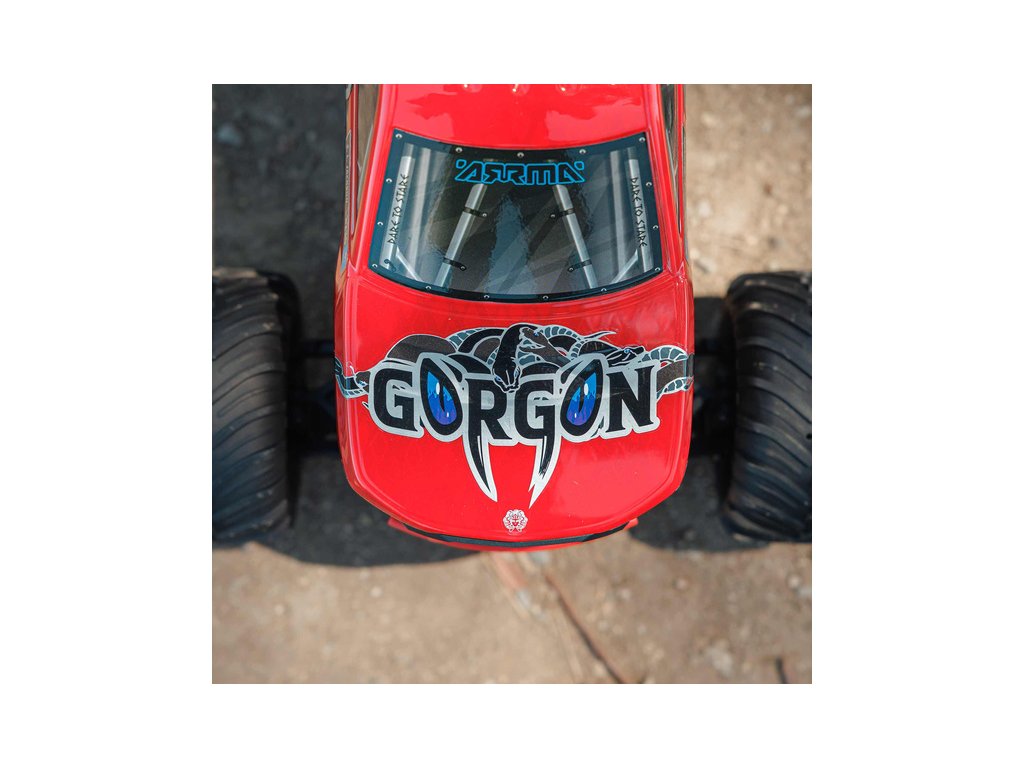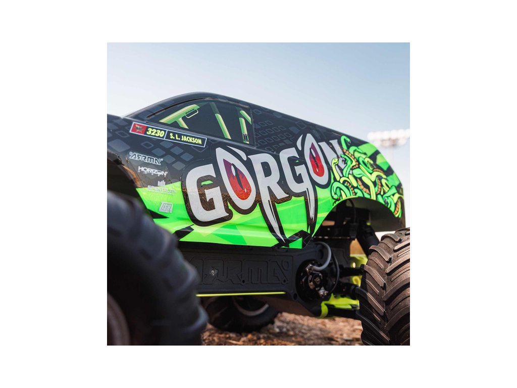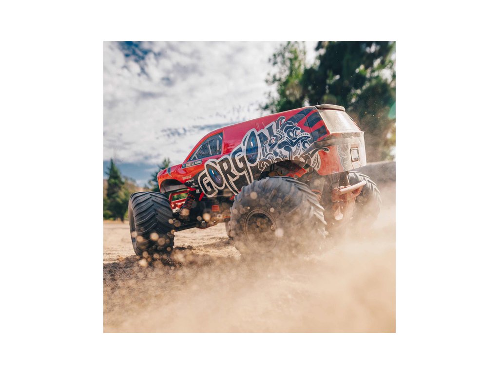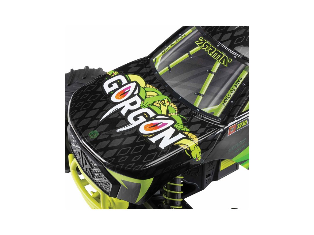 Ihned po vybalení přitáhne Gorgon vaši pozornost díky svému originálnímu vzhledu. Karoserie je z výroby dokončena ve velmi atraktivním moderním stylu a je barevně sladěna s jednotlivými díly šasi, jako jsou pružiny, přihrádka na baterii, kluzné desky a nárazníky. Osvědčená technologie ARRMA má díky kompozitnímu šasi vysokou odolnost. Nezávislé zavěšení, olejové tlumiče a nastavitelná světlá výška zajišťují komfortní jízdu. Pro nezastavitelnou trakci přenáší 2WD převodovka výkon ze stejnosměrného motoru MEGA 550 do masivních pneumatik dBoots ® Chevron o rozměru 130mm, nalepených na nylonových discích 57mm. Použité kovové převody jsou dostatečně odolné i pro případný upgrade na střídavý pohon.