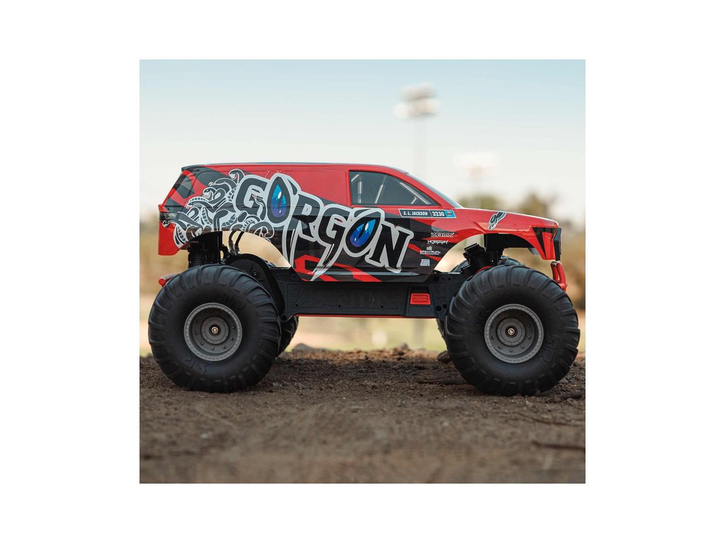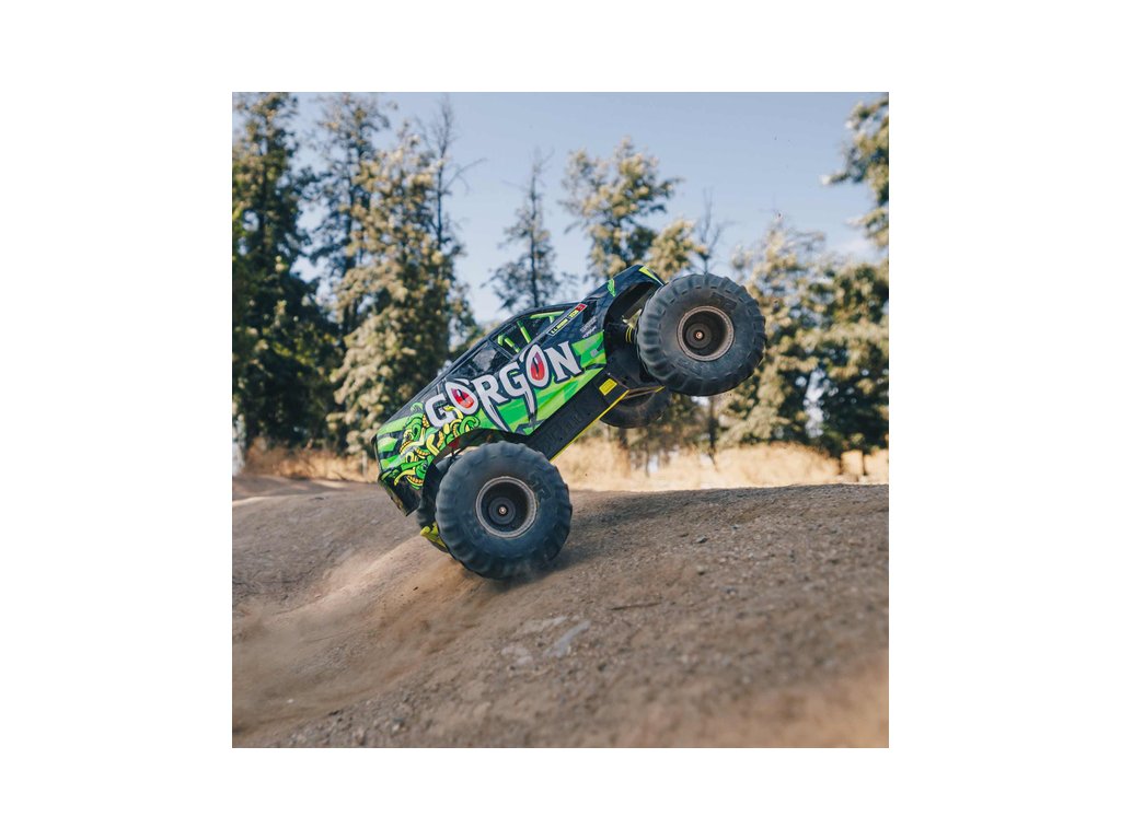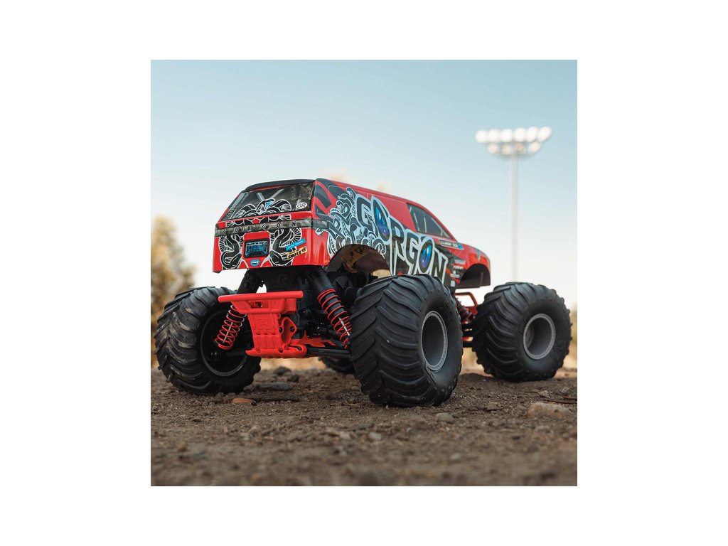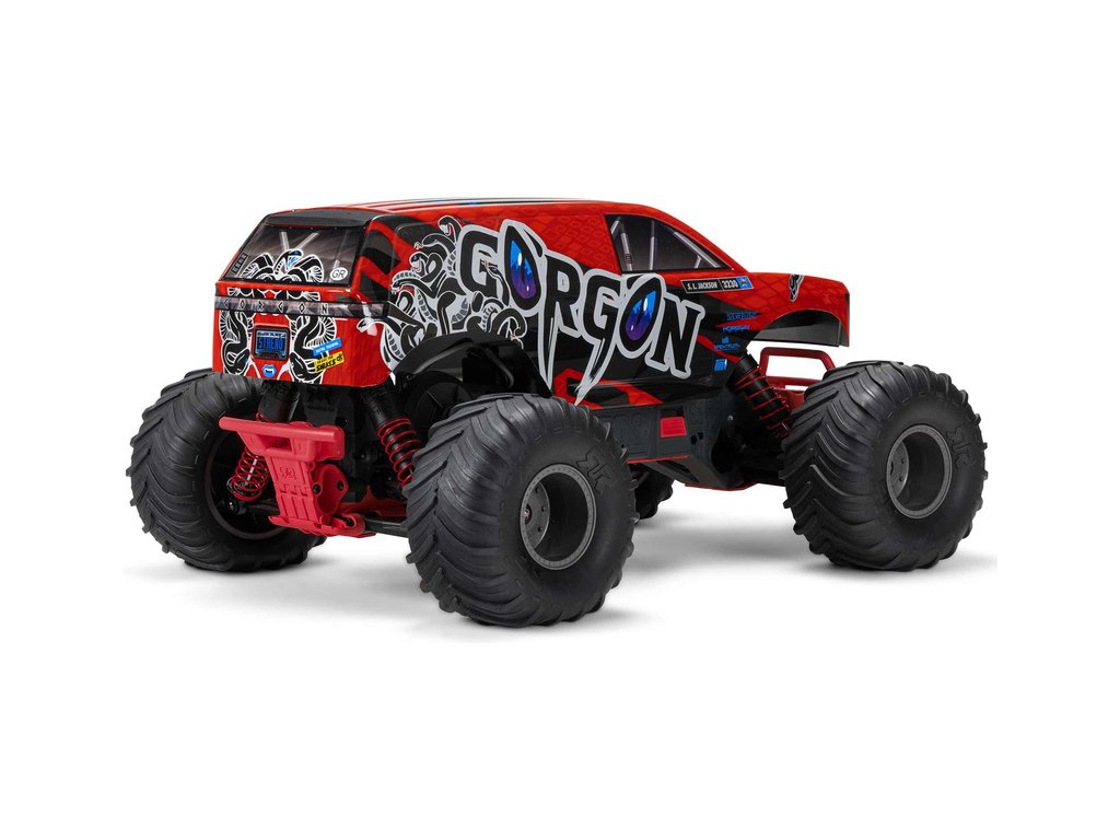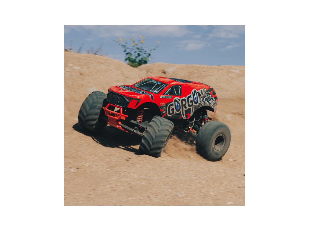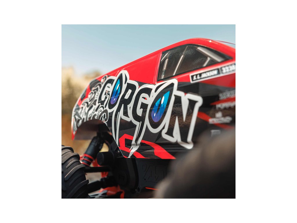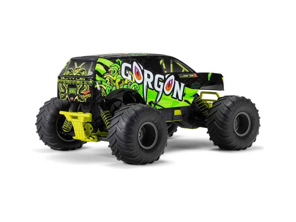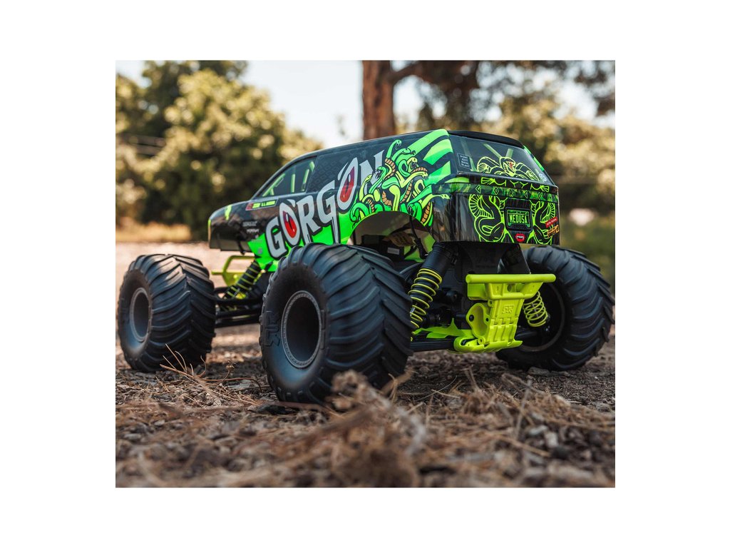 Ihned po vybalení přitáhne Gorgon vaši pozornost díky svému originálnímu vzhledu. Karoserie je z výroby dokončena ve velmi atraktivním moderním stylu a je barevně sladěna s jednotlivými díly šasi, jako jsou pružiny, přihrádka na baterii, kluzné desky a nárazníky. Osvědčená technologie ARRMA má díky kompozitnímu šasi vysokou odolnost. Nezávislé zavěšení, olejové tlumiče a nastavitelná světlá výška zajišťují komfortní jízdu. Pro nezastavitelnou trakci přenáší 2WD převodovka výkon ze stejnosměrného motoru MEGA 550 do masivních pneumatik dBoots ® Chevron o rozměru 130mm, nalepených na nylonových discích 57mm. Použité kovové převody jsou dostatečně odolné i pro případný upgrade na střídavý pohon.