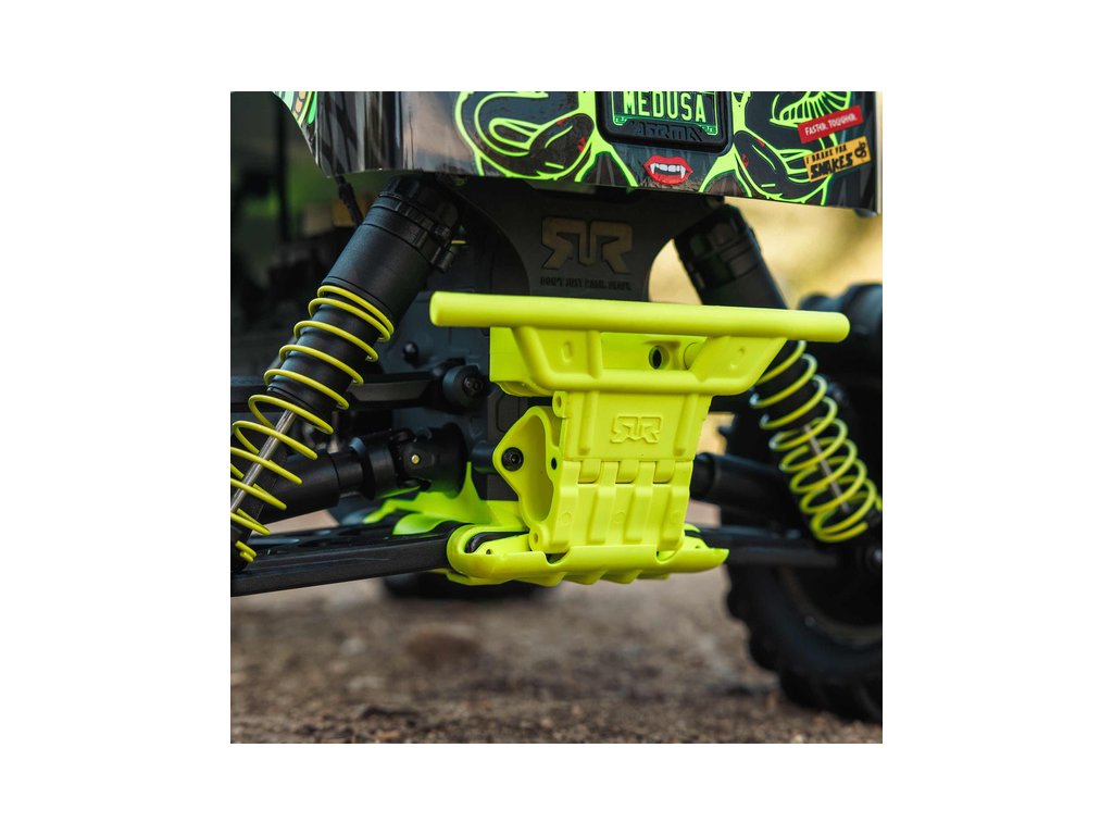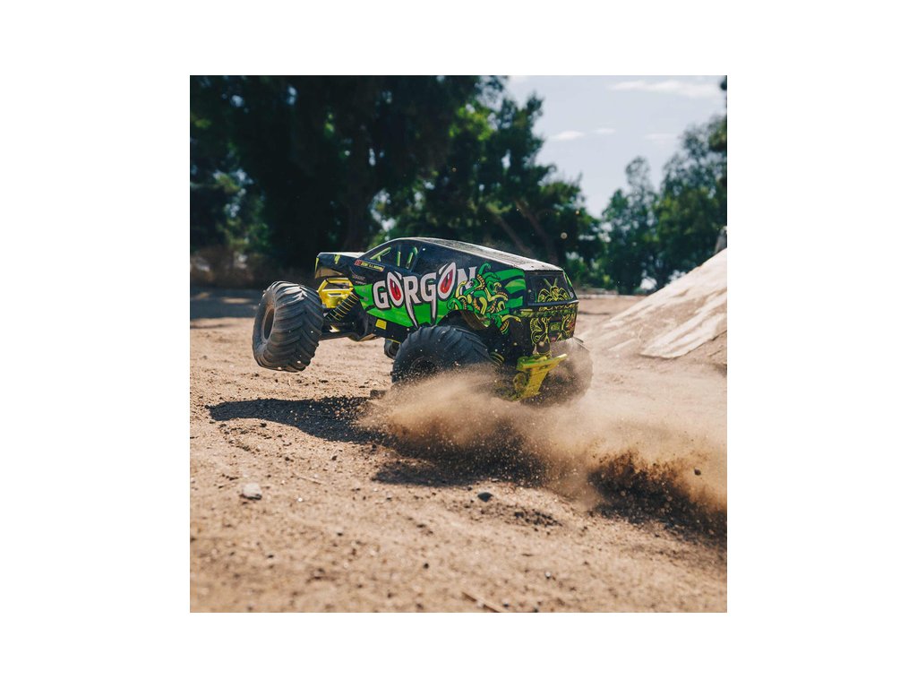 Ihned po vybalení přitáhne Gorgon vaši pozornost díky svému originálnímu vzhledu. Karoserie je z výroby dokončena ve velmi atraktivním moderním stylu a je barevně sladěna s jednotlivými díly šasi, jako jsou pružiny, přihrádka na baterii, kluzné desky a nárazníky. Osvědčená technologie ARRMA má díky kompozitnímu šasi vysokou odolnost. Nezávislé zavěšení, olejové tlumiče a nastavitelná světlá výška zajišťují komfortní jízdu. Pro nezastavitelnou trakci přenáší 2WD převodovka výkon ze stejnosměrného motoru MEGA 550 do masivních pneumatik dBoots ® Chevron o rozměru 130mm, nalepených na nylonových discích 57mm. Použité kovové převody jsou dostatečně odolné i pro případný upgrade na střídavý pohon.