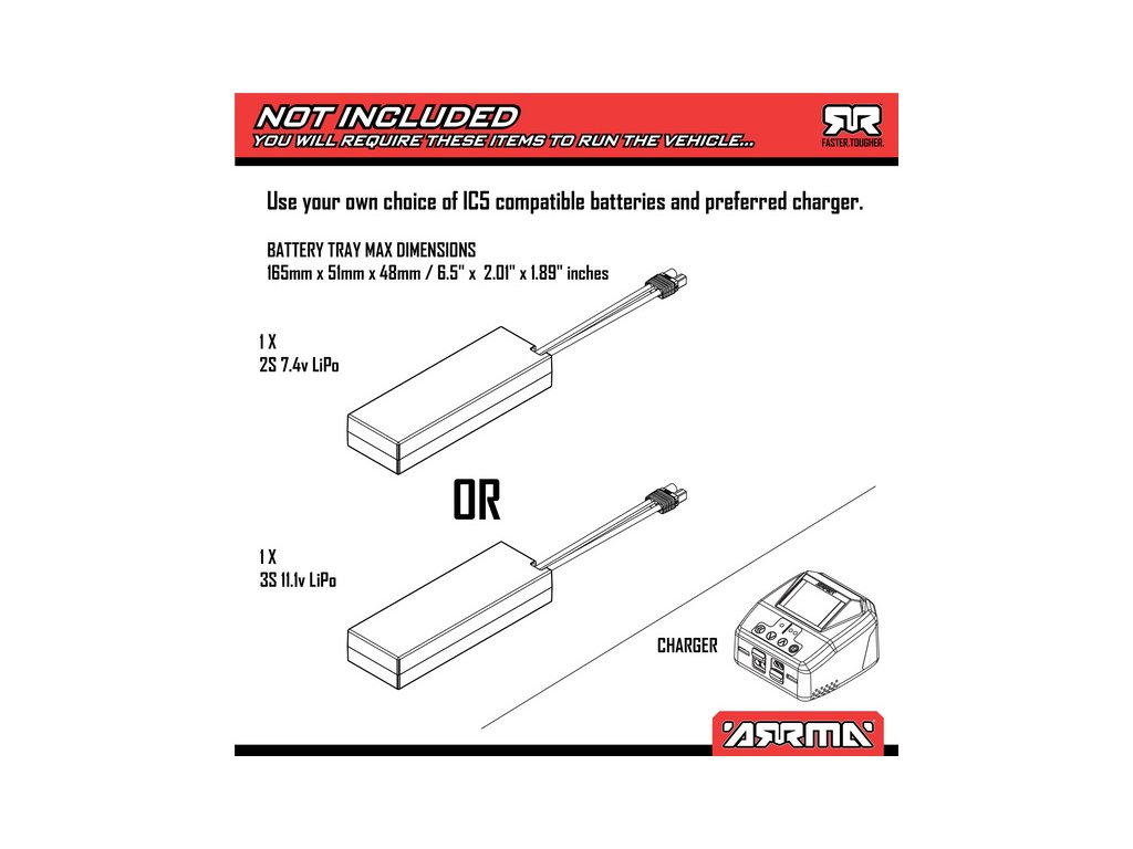 Model lze provozovat na 2 až 3 článkový LiPo akumulátor. Akumulátor by měl být osazen konektorem EC5 nebo IC5. Pro běžné ježdění doporučujeme 2 článkový LiPo akumulátor (7.4 V).