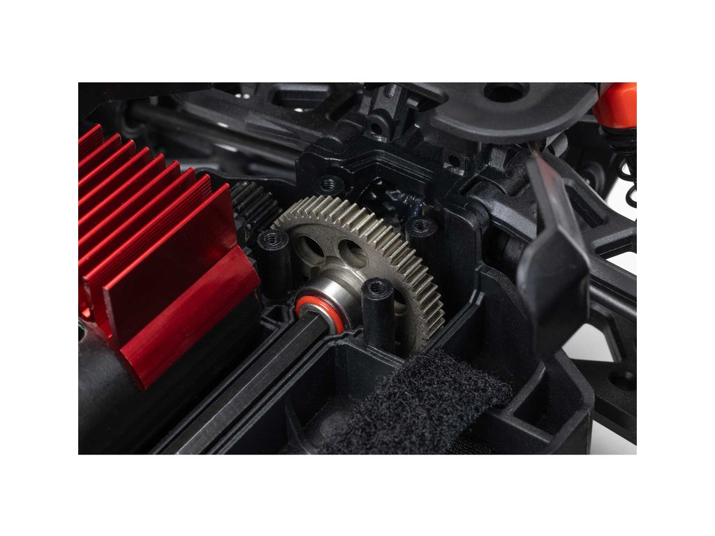 Převodovka má kovová ozubená kola pro dlouhou životnost. Dokonce i nainstalované voděodolné* servo řízení Spektrum SX110 má kovové převody.