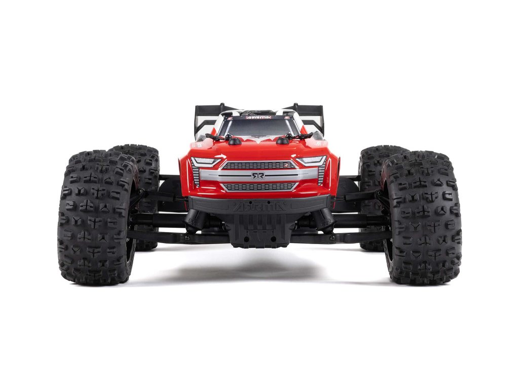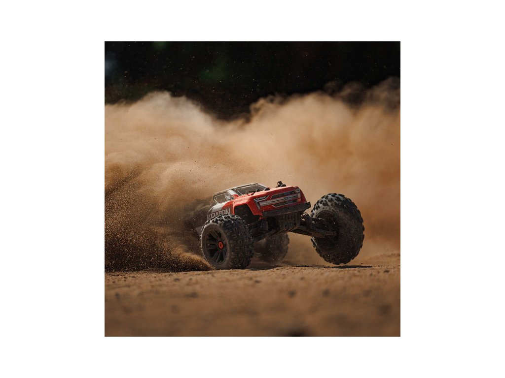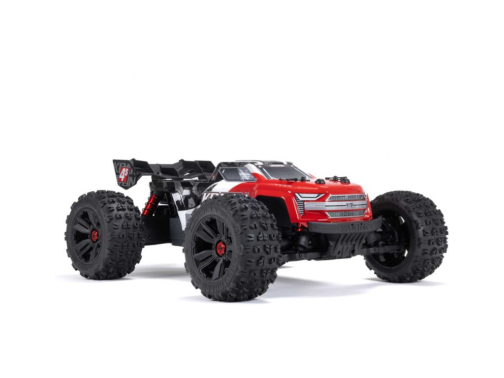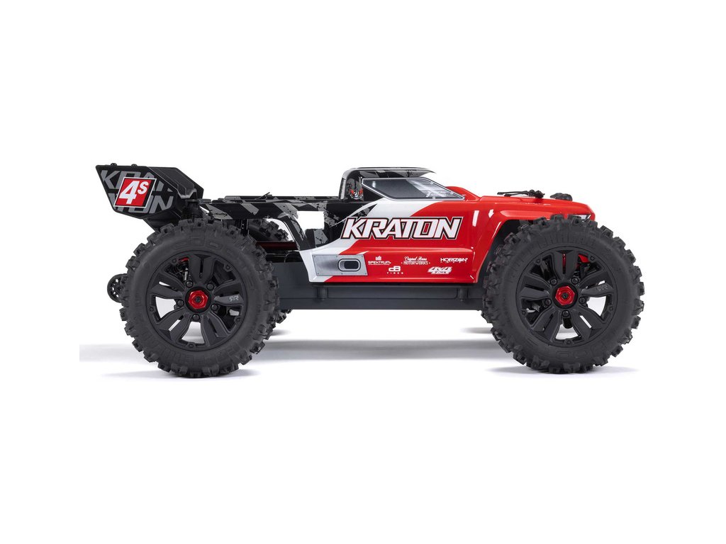 RC model Arrma Kraton 4S V2 BLX je poháněný střídavým motorem s brutální akcelerací a jede rychlostí až 80 km/h. Nově obsahuje výkonnější elektronikou a středový diferenciál. Odolné kompozitní šasi a kovové pohonné ústrojí, olejové tlumiče a detailní karoserie.