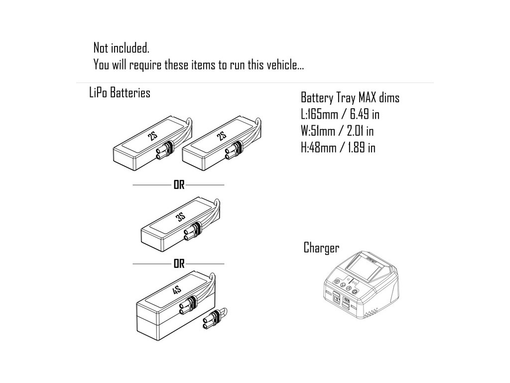 - Pro maximální možnou rychlost LiPo akumulátor Spektrum 14.8 V 5000 mAh s technologií Smart, nebo Spektrum G2 14.8 V 5000 mAh s technologií Smart G2.