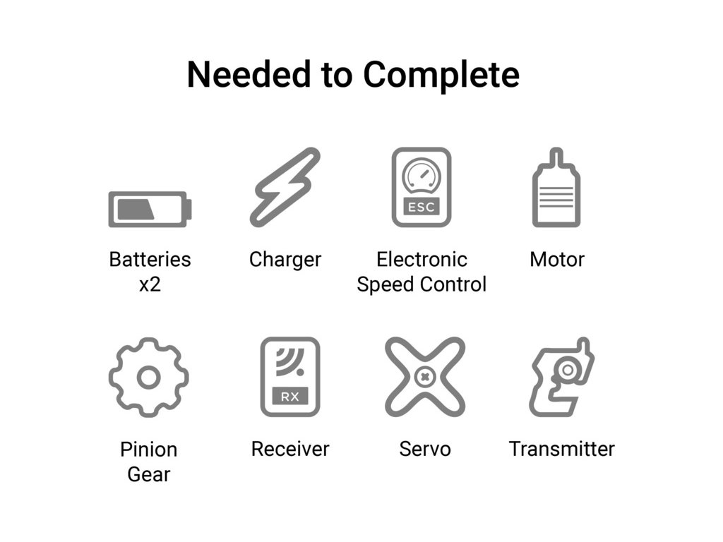 Pro zprovoznění modelu je nutné doplnit motor, regulátor, servo řízení, RC soupravu, pohonný akumulátor, vhodný nabíječ a 4x AA baterie do vysílače.