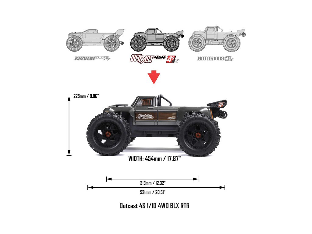 RC model Arrma Outcast 4S V2 BLX, pro kaskadérské kousky je poháněný střídavým motorem s brutální akcelerací a jede rychlostí až 80 km/h. Nově obsahuje výkonnější elektronikou a středový diferenciál. Odolné kompozitní šasi a kovové pohonné ústrojí, olejové tlumiče a detailní karoserie.