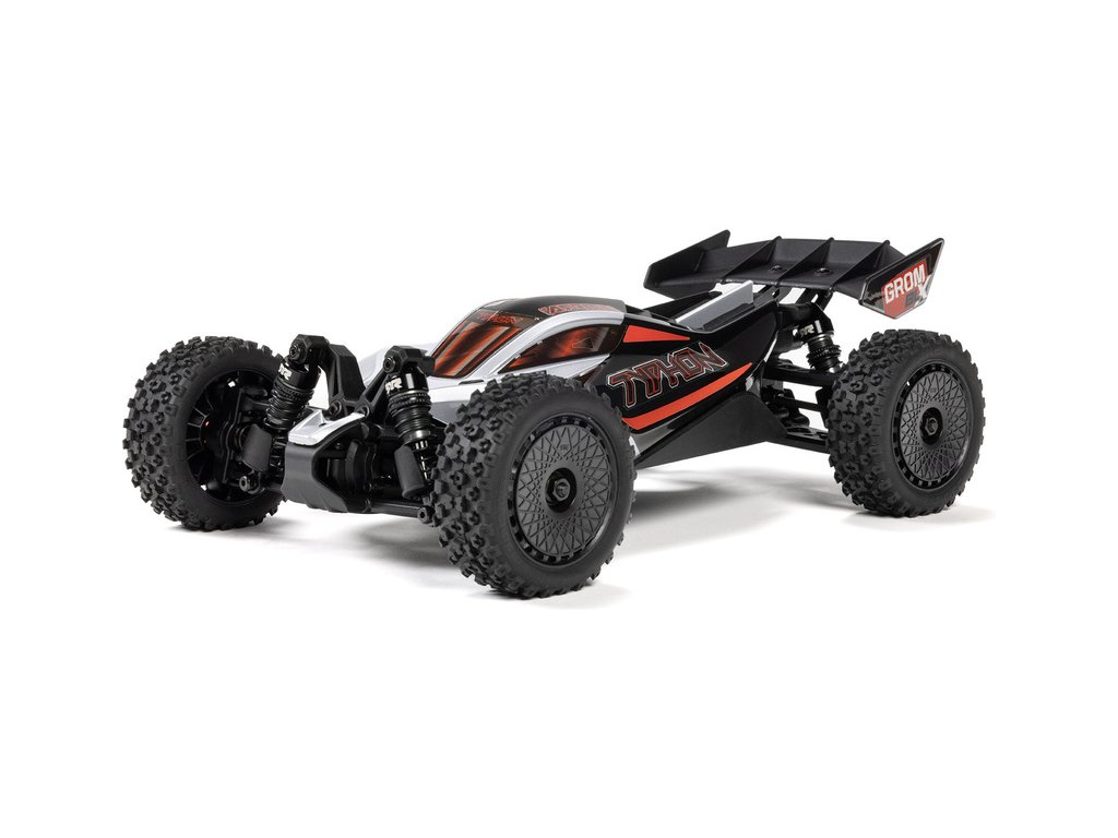 RC model auta Arrma Typhon Grom v měřítku 1:18, s náhonem 4WD, výkonným střídavým motorem a rychlostí až 56 km/h. Precizně zkonstruovaná malá zábavná buggy. Továrně instalované upgrady, stabilizace DSC.