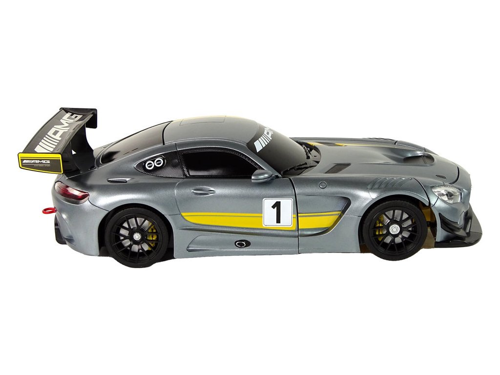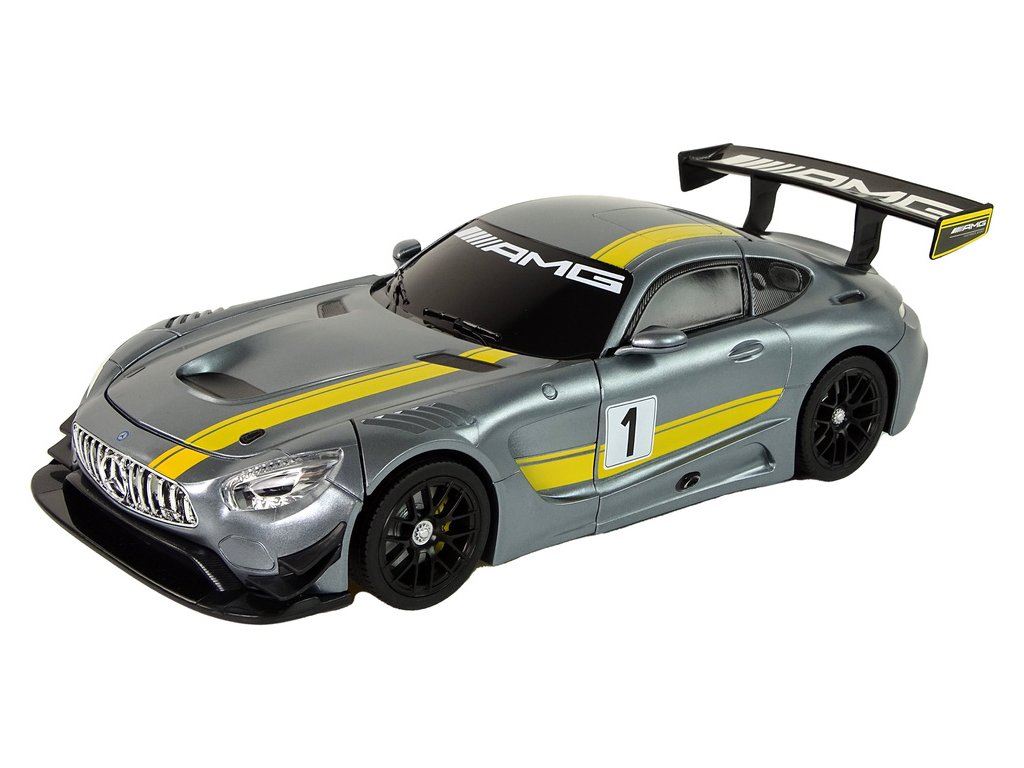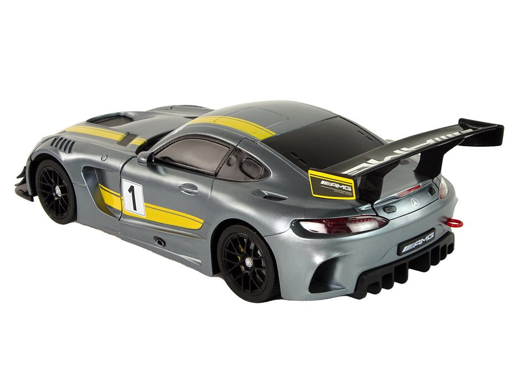 Model v elegantní stříbrné barvě s žlutými detaily působí dynamicky a sportovně. Nechybí ani charakteristické křídlo (spoiler) a precizně zpracované proporce, které odpovídají originálnímu závodnímu Mercedesu-AMG GT3.