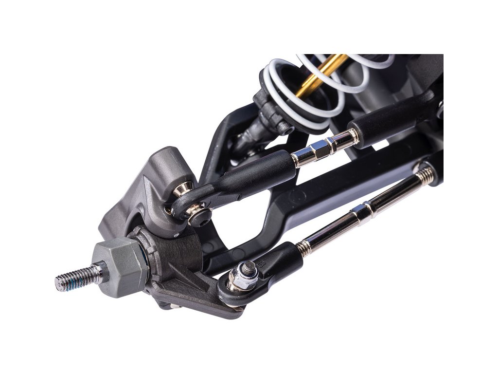 Odolné ocelové spojovačky umožňují nastavení odklonu kol a sbíhavosti pro specifické podmínky na trati. Koncovky s kulovými čepy jsou vyrobeny z vysoce pevného materiálu, aby nedošlo k uvolnění v závitu.