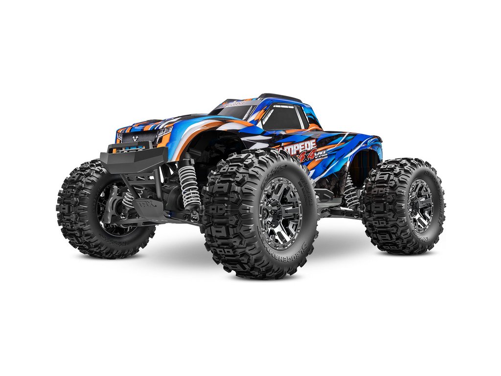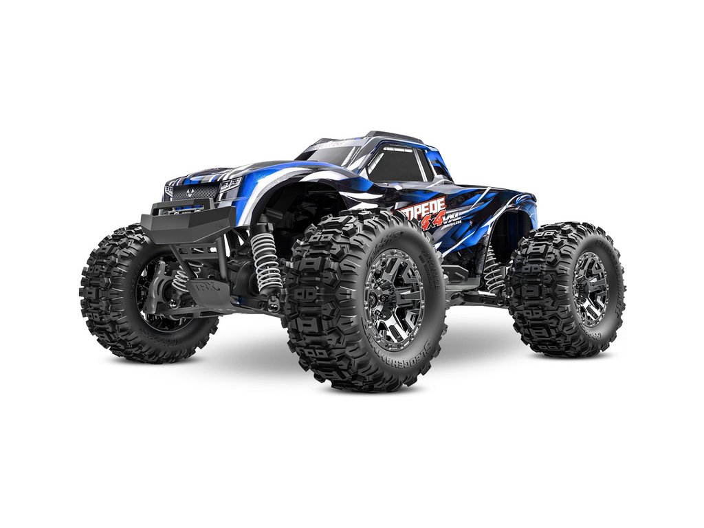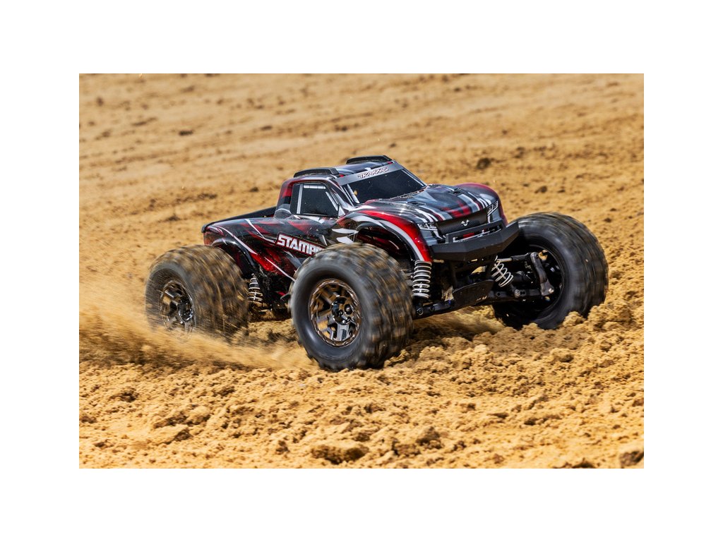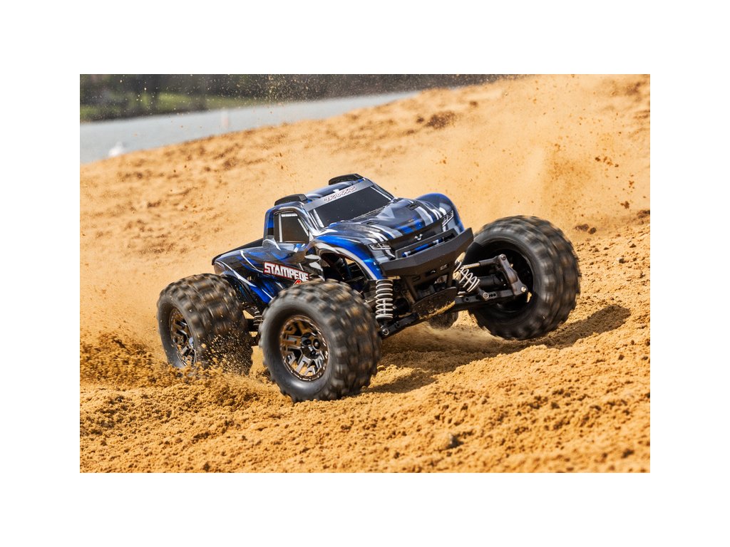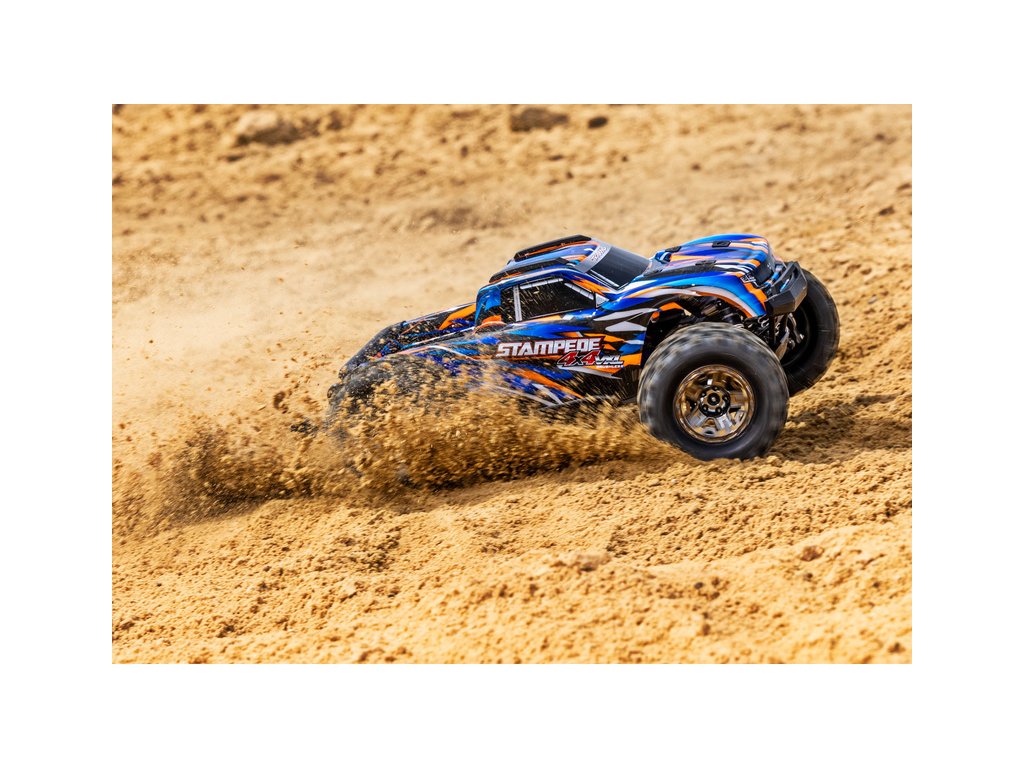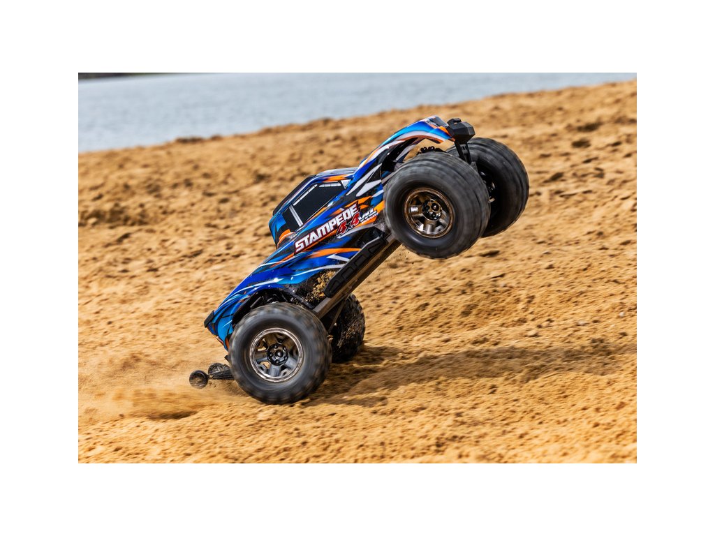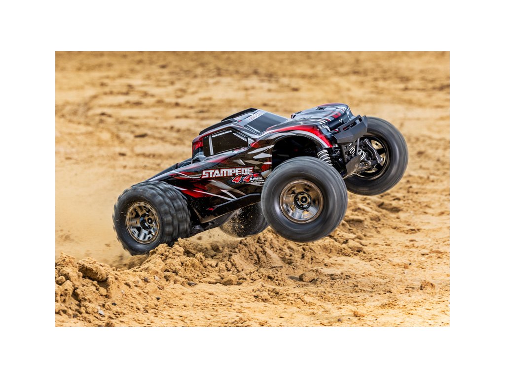 RC model auta Traxxas Stampede VXL v měřítku 1:10, s náhonem 4x4, nadrozměrným střídavým motorem 540XL, regulátorem VXL-3S, dosáhne rychlosti až 96 km/h. Elektronická stabilizace jízdy. Komponenty pro vysokou odolnost - Extreme Heavy Duty, bezsponková karoserie a pneu Sledgehammer.