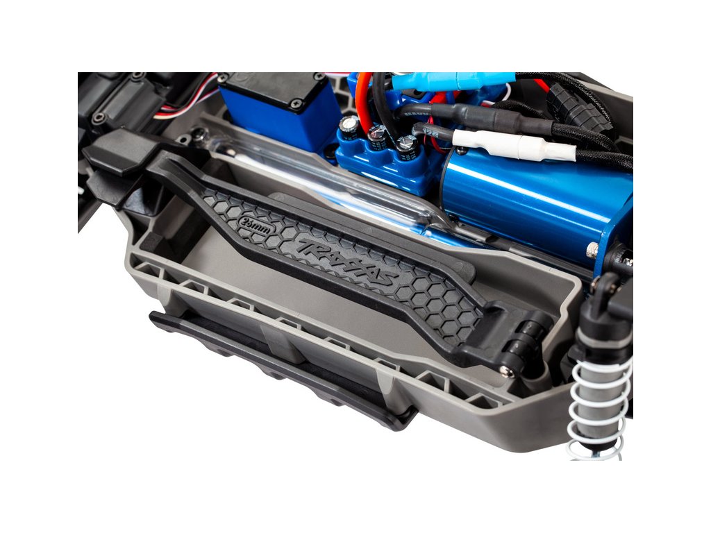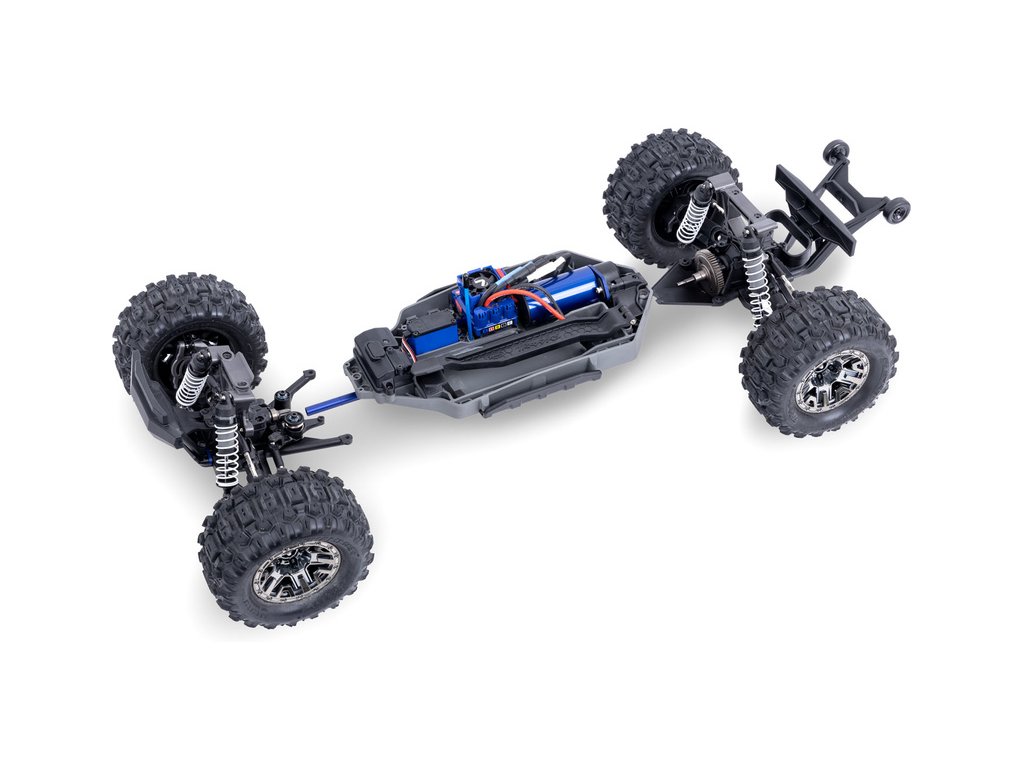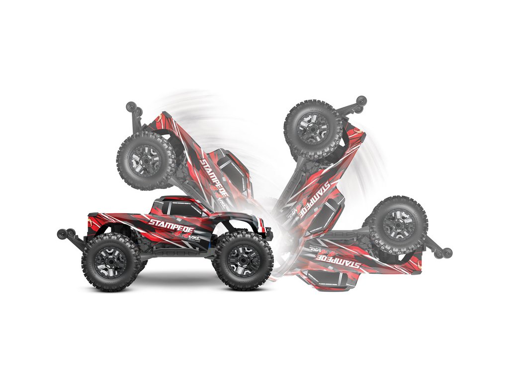 Osvědčená konstrukce modelu Stampede byla zachovaná, včetně modulární konstrukce šasi, špičkové geometrie zavěšení a pohonného ústrojí. Přední a zadní diferenciál nově doplňuje ještě středový diferenciál pro perfektní distribuci výkon mezi nápravy. Pro vyšší stabilitu byl prodloužen rozvor na 295 mm s minimálními převisy a vysokými nájezdovými úhly. Do přihrádky baterie lze nově vložit ploché 7 čl. akumulátory NiMH, jako u ostatních modelů Traxxas. Díky náhonu 4WD a střídavému pohonu zažijete nespočet hodin perfektní ovladatelnosti a bleskové akcelerace.