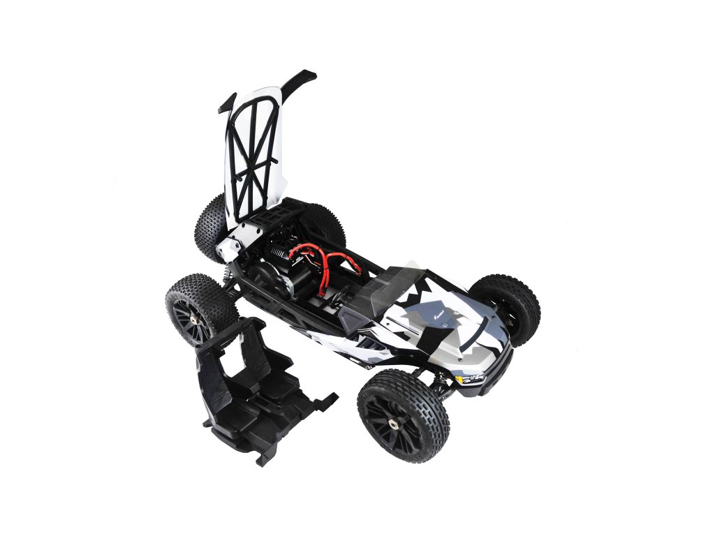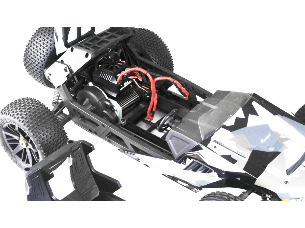 Představujeme terénní model Hammerhead Dune Buggy 1:6 2WD v celé své kráse. Velmi dobře dimenzovaný pohon s 2350 kv střídavým motorem s vysokým točivým momentem a 160 ampérovým regulátorem zaručují čistou zábavu z jízdy ve spojení s působivou akcelerací a vysokou maximální rychlostí. Hammerhead je zásadně lepší než všechny buggy se spalovacím motorem o objemu 28 ccm. Díky továrně instalovanému gyroskopickému stabilizačnímu systému lze s Hammerhead jezdit jako s autem 4WD. Plně hliníkové olejové tlumiče, 15kg servo řízení, hliníková nosná deska, CNC frézované diferenciály a pneumatiky s vysokou přilnavostí jsou další špičkové vlastnosti této buggy v měřítku 1:6. Hlavní ozubené kolo je vyrobeno z oceli, a proto odolá i těm nejtvrdším nárokům. Mimořádný cool a cenami ověnčený design také dělá z Hammerhead poutač na každé závodní dráze. Moderní dálkové ovládání 2,4 GHz je citlivé a snadno padne do ruky. Doporučujeme používat 2 x 7,4V LiPo baterie Hardcase s 5000-7500mAh, 45-65C. (lze také použít 2 x 3S, ale je nutná úprava)