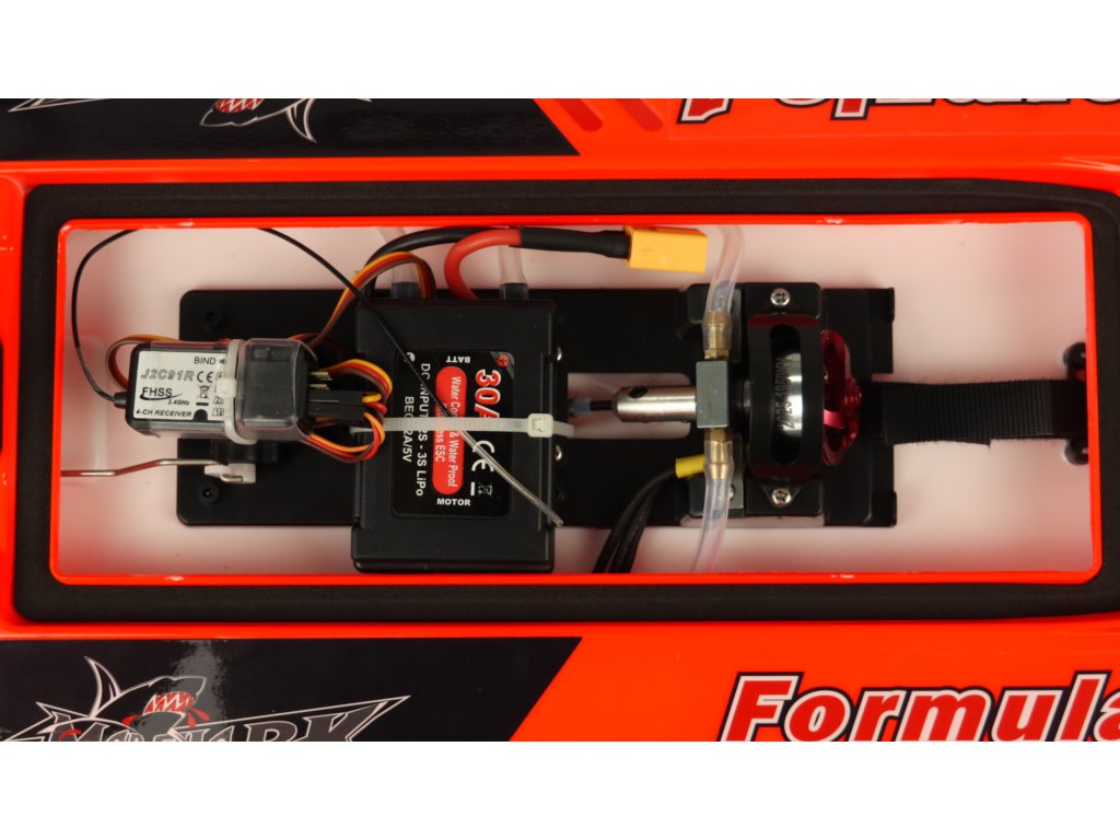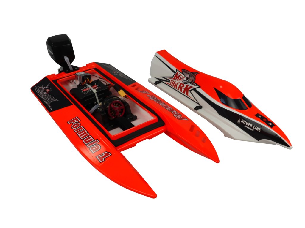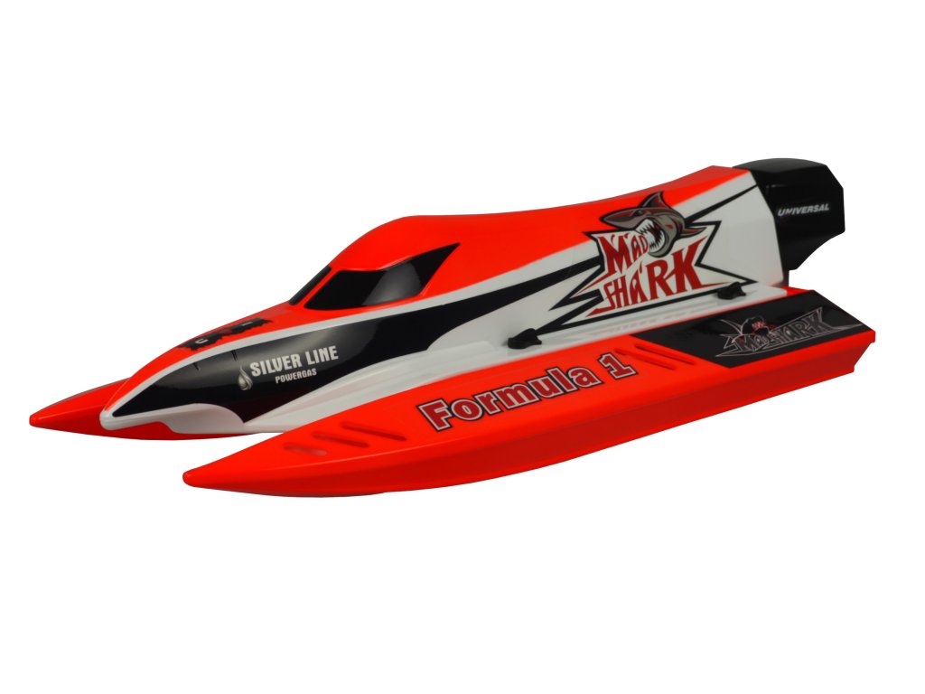 RC člun Mad Shark V2 je vybaven vodou chlazeným střídavým motorem 2212 s napětím 3300 kV, který umožňuje dosáhnout rychlosti až 60 km/h. Trup o délce 430 mm je hluboce tažený z nárazuvzdorného plastu ABS a je kvalitně lakován. Loď je řízena přesným servem řízení s bezvůlovým propojením záďového kormidla. Člun je sestaven tak, aby byl připraven k provozu, a je vybaven proporcionálním dálkovým ovládáním 2,4 GHz. Do člunu byl také integrován zaplavovací kanál, takže se v obrácené poloze automaticky srovná. K provozu je zapotřebí pouze 3S 11,1V LiPo akumulátor.