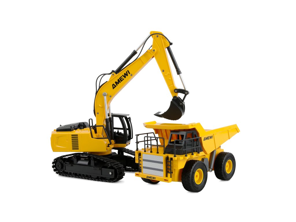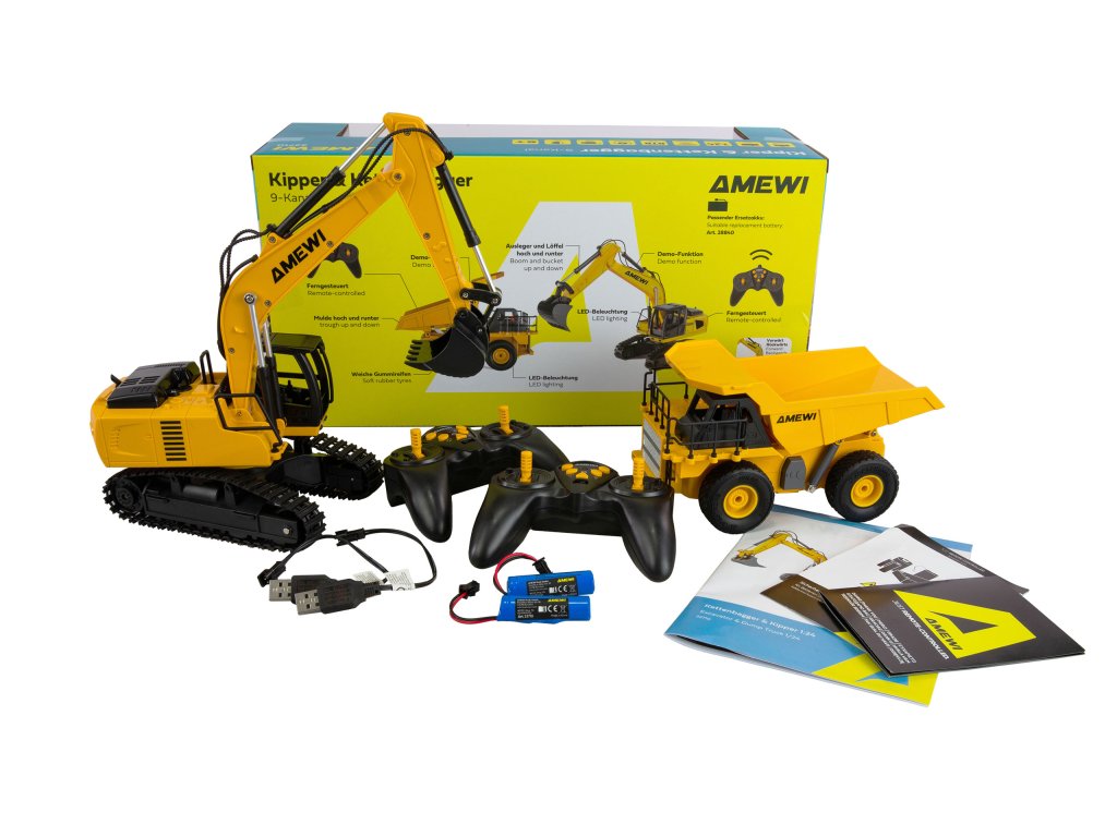 Tato sada 2 v 1, která se skládá z dálkově ovládaného pásového bagru a sklápěče, přináší realistickou akci ze staveništiě do každého dětského pokoje. Obě vozidla se vyznačují dětským, ale detailním žluto-černým designem a nabízejí všestranné funkce pro vzrušující hraní. Pásový bagr zaujme samostatně ovládanými gumovými pásy, které umožňují přesné manévry, jako je otáčení na místě. Rameno a lžíce lze ovládat dálkovým ovládáním a kabinu lze ručně otáčet o 360°. Snadno ovladatelná sklápěcí korba sklápěče dodává herní hodnotě ještě větší hodnotu. Obě vozidla jsou vybavena funkcí automatické demo, která automaticky předvede všechny funkce stisknutím tlačítka. Bezporuchový rádiový systém 2,4 GHz zajišťuje plynulé ovládání bez překrývání frekvencí. Díky elektronice odolné proti stříkající vodě a robustní konstrukci jsou oba modely vhodné pro použití v interiéru i exteriéru. LED osvětlení na rypadle zajišťuje vzrušující operace i za soumraku. S až 20 minutami jízdy na jedno nabití baterie, vyměnitelnými bateriemi a nabíjecím kabelem USB nic nebrání dlouhým herním dobrodružstvím. Sada RTR obsahuje vše, co potřebujete k okamžitému hraní, s výjimkou standardních AA baterií pro dva dálkové ovladače.