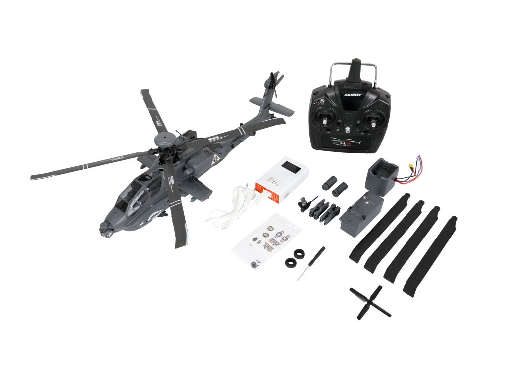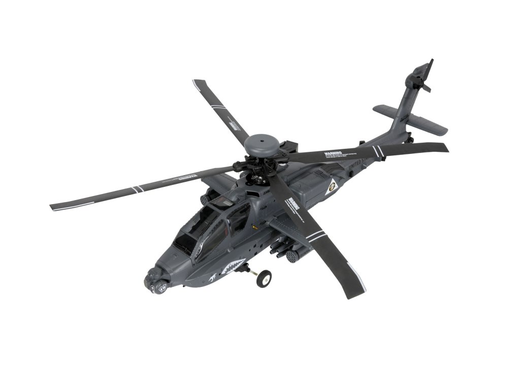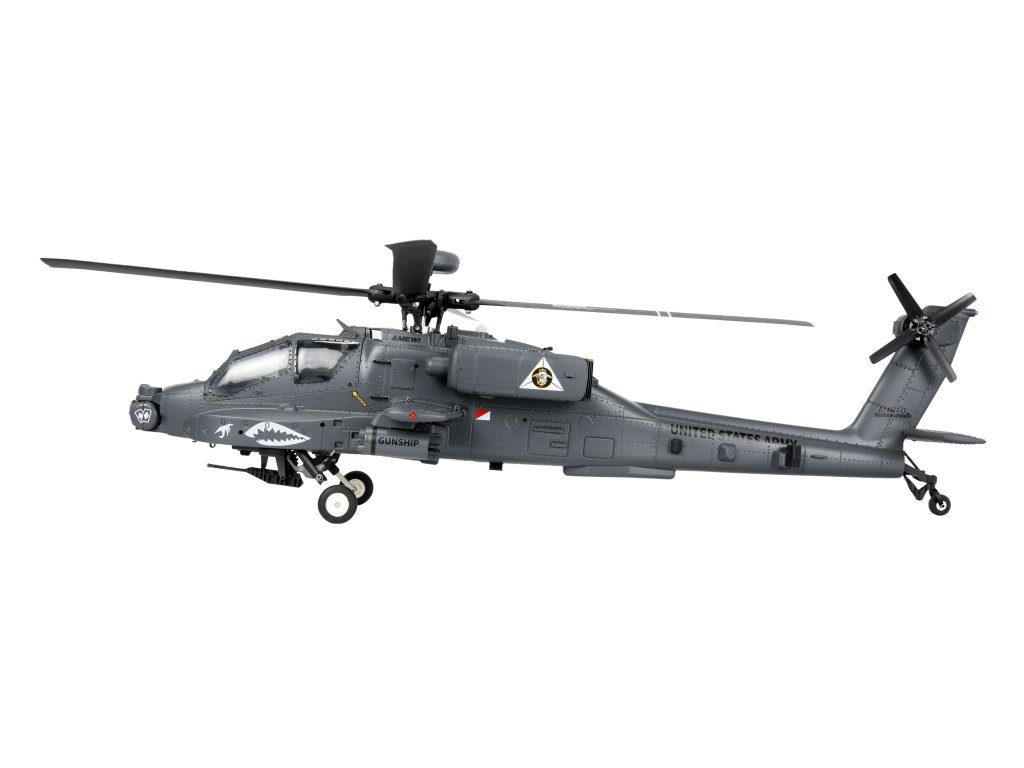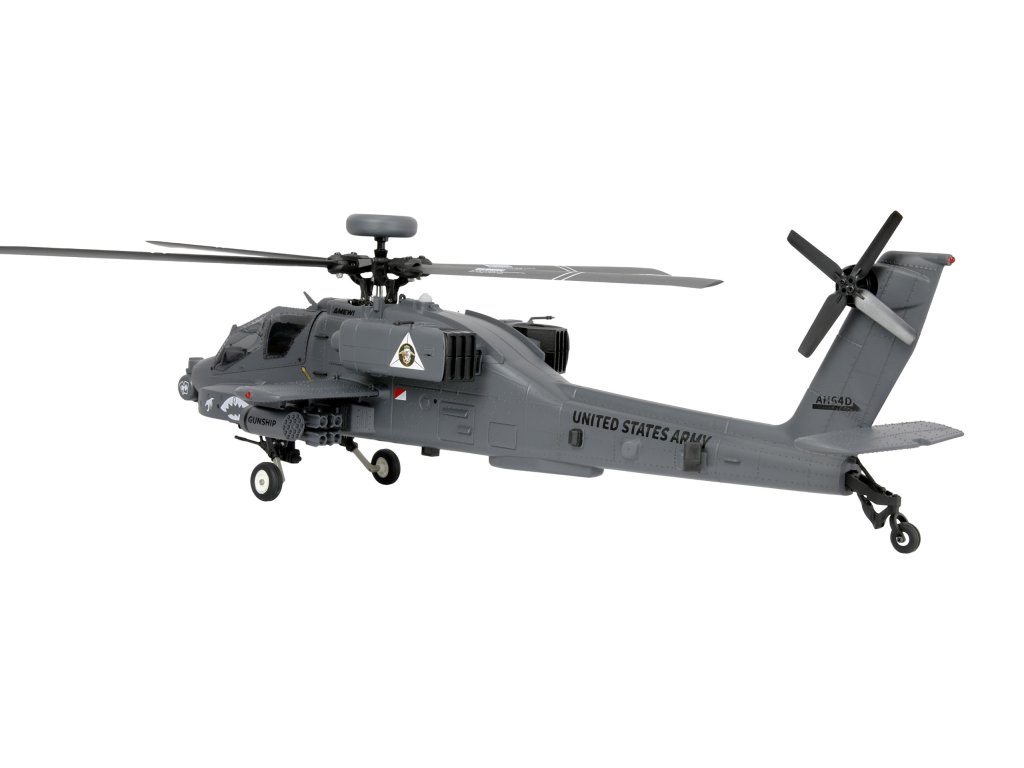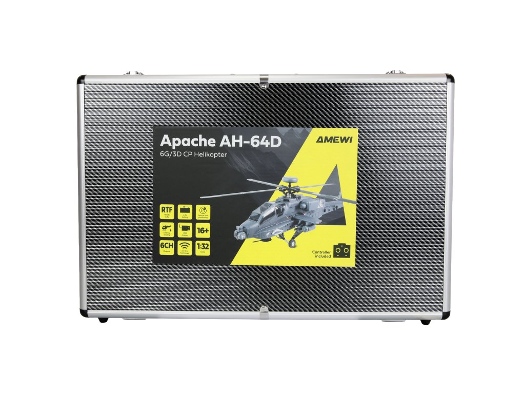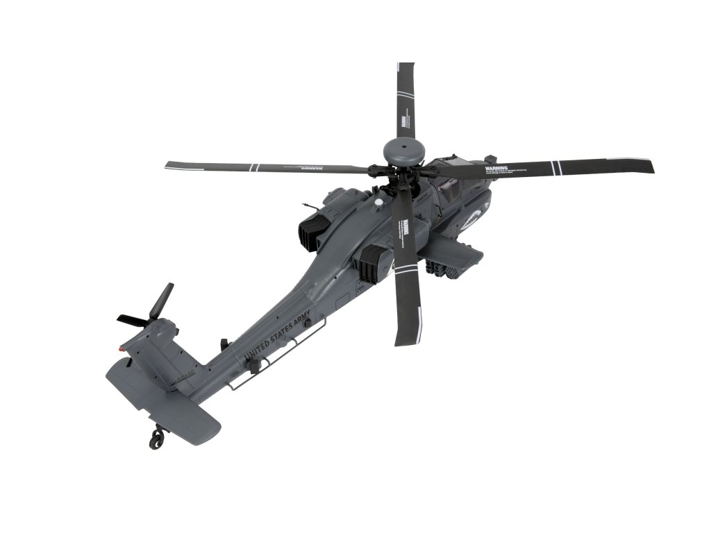 RC vrtulník Apache AH-64D 1:32 je věrnou replikou legendárního bitevního vrtulníku americké armády. Kombinuje precizní scale zpracování s moderní elektronikou a špičkovým letovým výkonem. Model je dodáván jako kompletní RTF sada (Ready-to-Fly), tedy připravený k letu – stačí vložit baterie do vysílače.