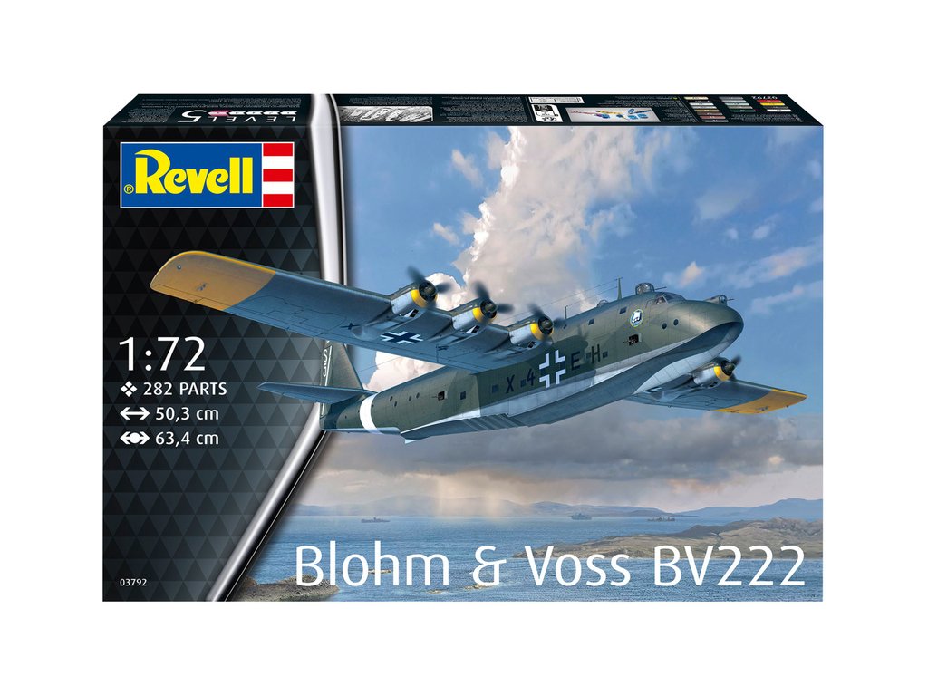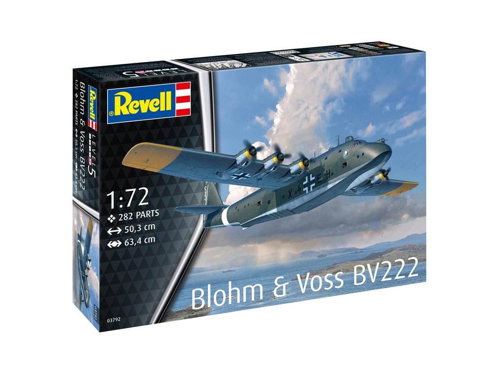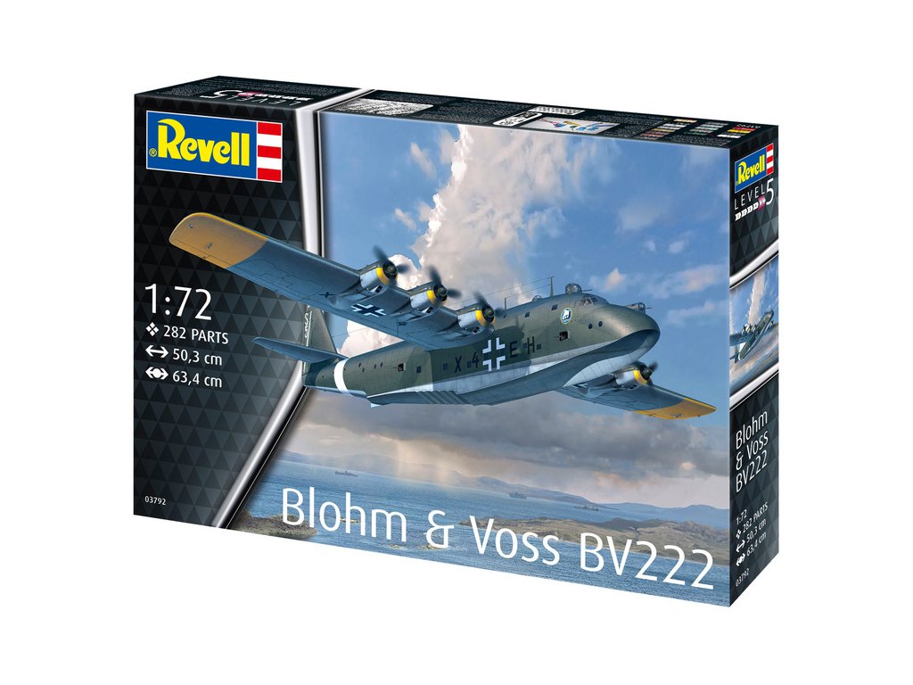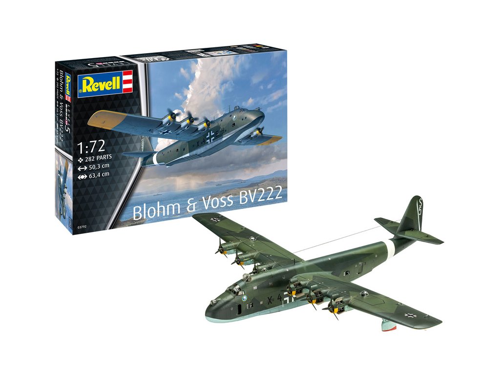 Plastikový model Revell 03792 – letadlo Blohm & Voss BV222 v měřítku 1:72 ke slepení. Stavebnice obsahuje 282 dílků, délka 503 mm, obtížnost 5.