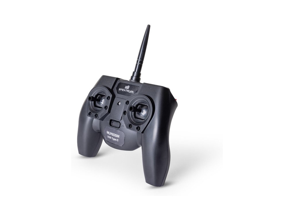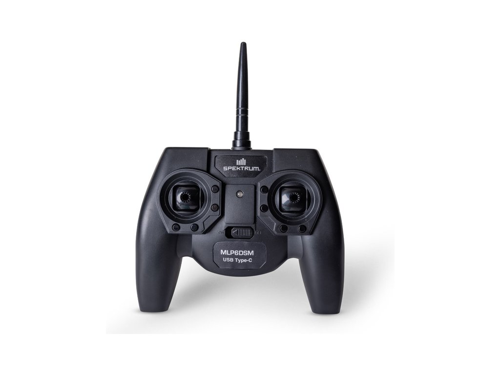 Šesti-kanálový vysílač Spektrum MLP6 v módu 2 (plyn na levé ruce) pro menší modely od Horizon Hobby. Vysílač má telemetrii, pomocí LED diody a zvukové signalizace indikují napětí pohonného akumulátoru u kompatibilních modelů. Nový USB-C konektor pro ovládání simulátoru.