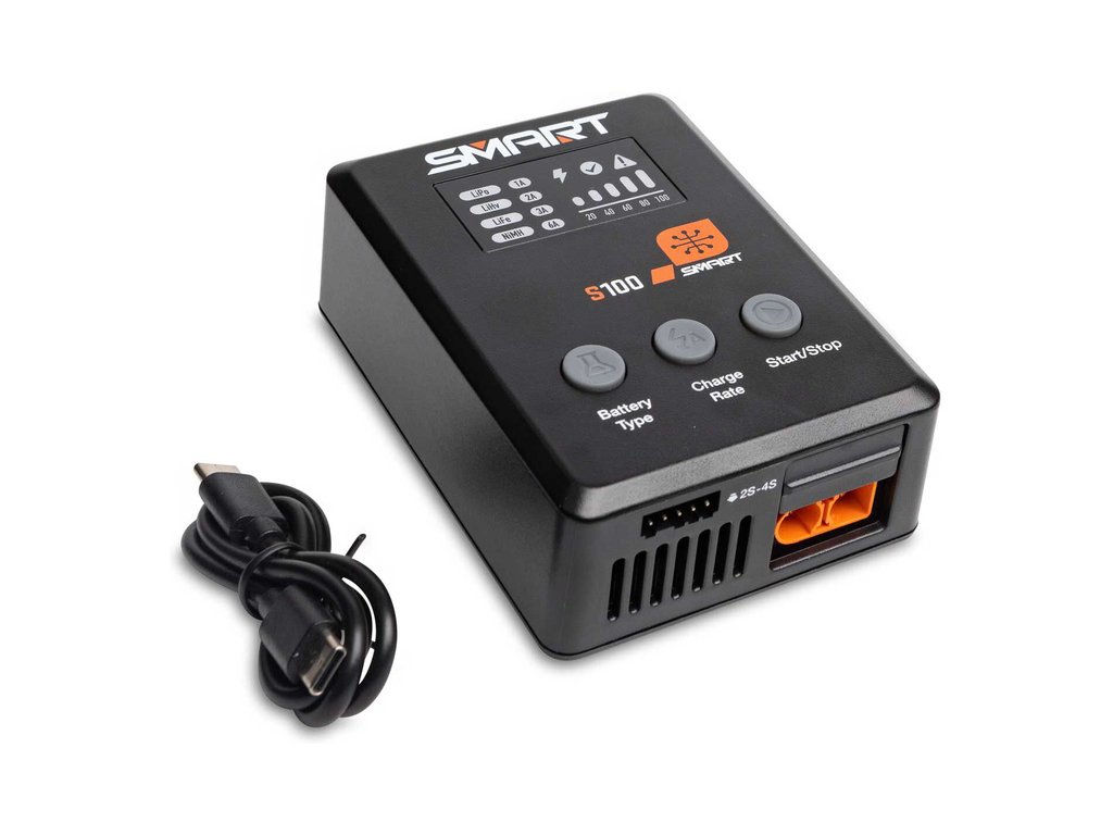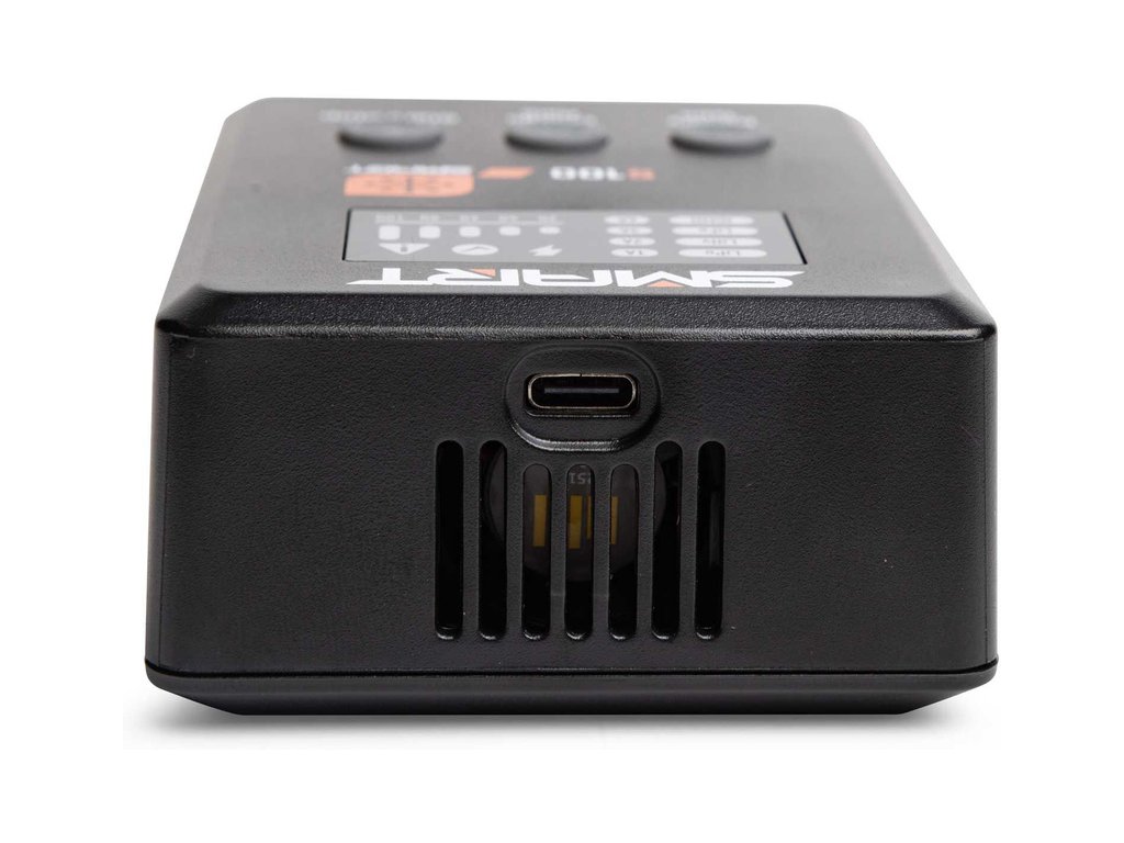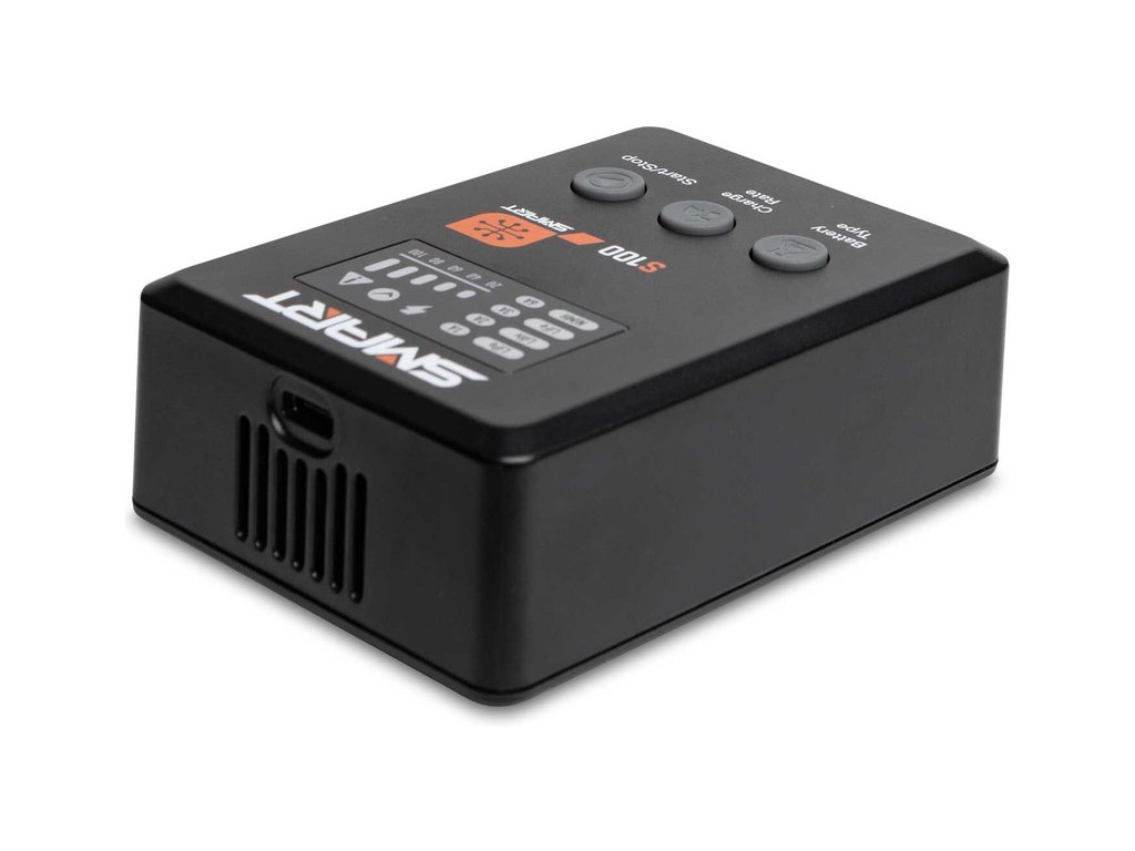 Nabíječ S100 je napájen přiloženým USB-C adaptérem a je praktickým nabíjecím řešením pro začátečníky. Baterie Smart G2 mají datový kabel s jedním jednoduchým připojením konektoru IC3® nebo IC5® – není proto potřeba samostatný balanční kabel. Můžete použit k nabíjení mnoha standardních hobby baterií 1S-4S LiPo, LiIon, LiHV, LiFe. Poznámka: S100 nebude nabíjet baterie NiMH jiné značky než Smart. Aktualizace firmwaru se provádí přes port USB-C.