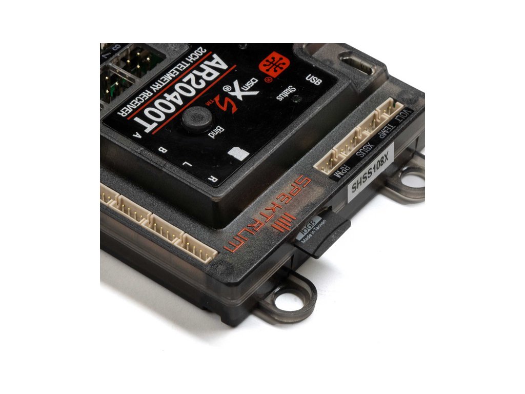 Přijímač AR20400T s 20 kanály a telemetrií (SRXL2). Redundantní napájení dvěma bateriemi (IC3). Určeno pro větší modely s více servy s vysokým proudovým zatížením až 35A. Micro USB konektor, slot na SD kartu pro záznam dat. Bartometrický senzor.