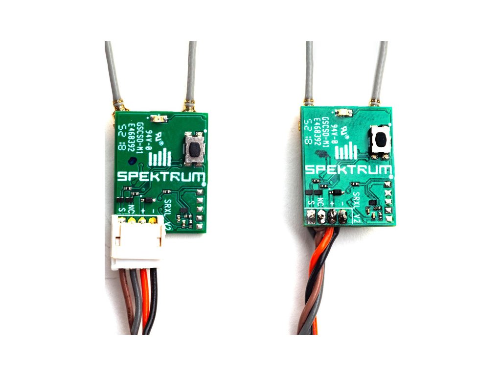 SPM4650 s hmotností pouze 1,4 gramu je menší než jakýkoli předchozí přijímač Spektrum Serial. Je připraven k instalaci do většiny modelů s řídicí jednotkou s minimálními požadavky na prostor. Přijímač je dodáván bez konektoru pro ty, kteří chtějí snížit hmotnost. Jednoduše připájíte kabely přímo k desce plošných spojů nebo připojte konektor a zapojte dodaný kabel z jednotky SPM4650 do kompatibilní řídicí jednotky.