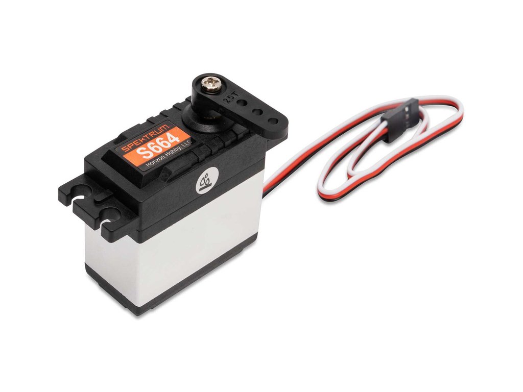 Standardní digitální voděodolné servo Spektrum S664, s kovovými převody a tisícihranem 25T. Napájení HV 6.0 - 7.4V, moment 16kg.cm @6V; 18,7kg.cm/7,4V, rozměry 40x20x41mm. Určeno pro RC modely aut.