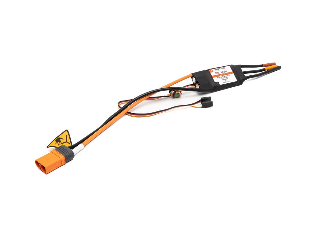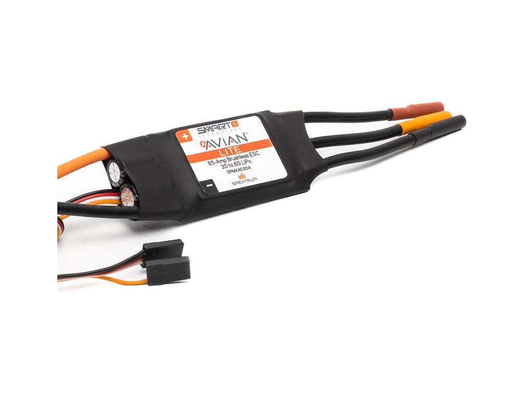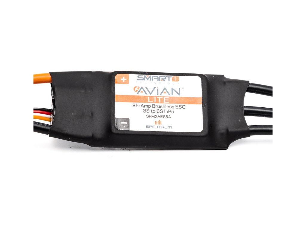 Náhradní díl pro RC model letadla E-flite Viper 1.1m SAFE Select: Spektrum Smart regulátor střídavý Avian lite 85A, napájení 3-6S LiPol, konektor IC5, BEC 6V, kabel 12 AWG.