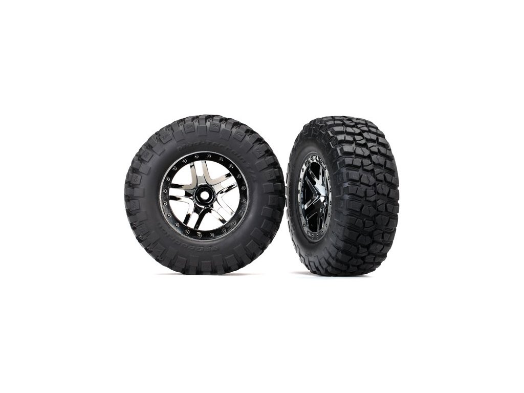 Kompletní zadní kola pro 2WD, přední i zadní pro 4WD RC auta Traxxas. Stříbrný disk Split-Spoke s pneumatikami BFGoodrich KM2 Mud Terrain (S1 super měkká směs) s vložkou.
