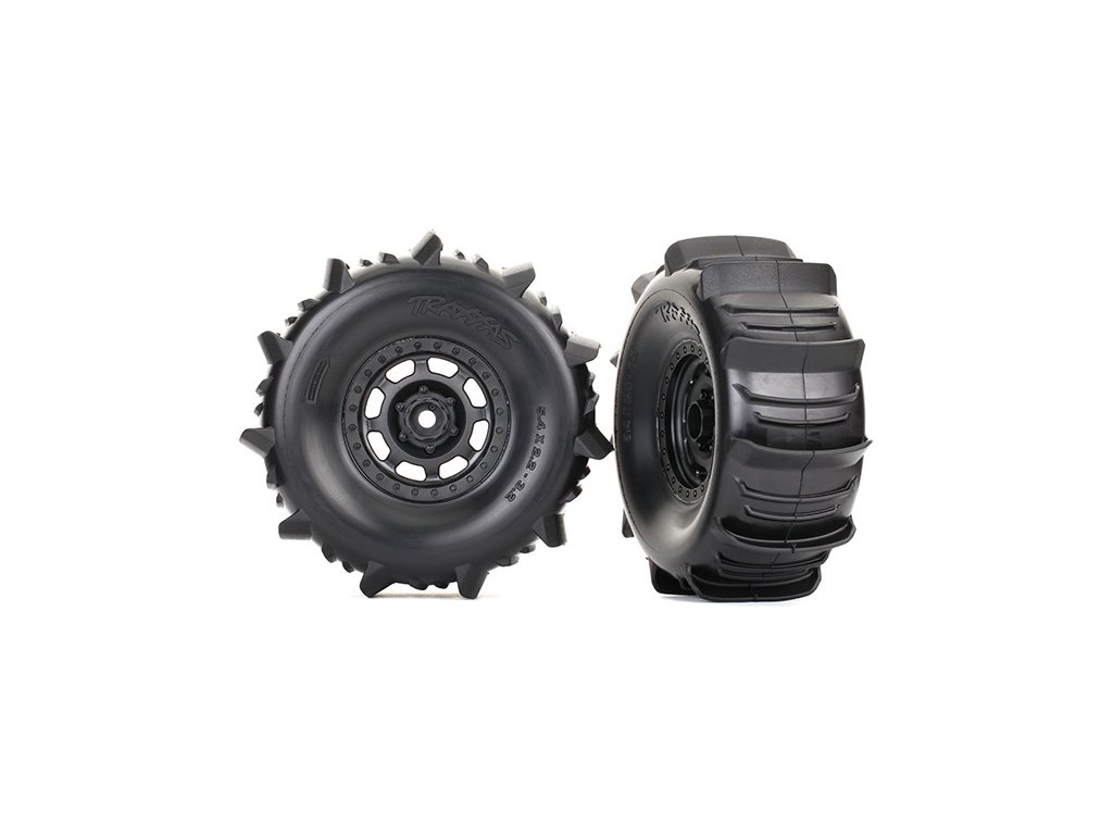 Kompletní univerzální kola pro Traxxas Unlimited Desert Racer. Černé disky Desert Racer® s lopatkovými pneumatikami (2 ks v balení). Paddle tires-lopatkové pneumatiky jsou vhodné do písku, sněhu nebo pro jízdu po vodní hladině.