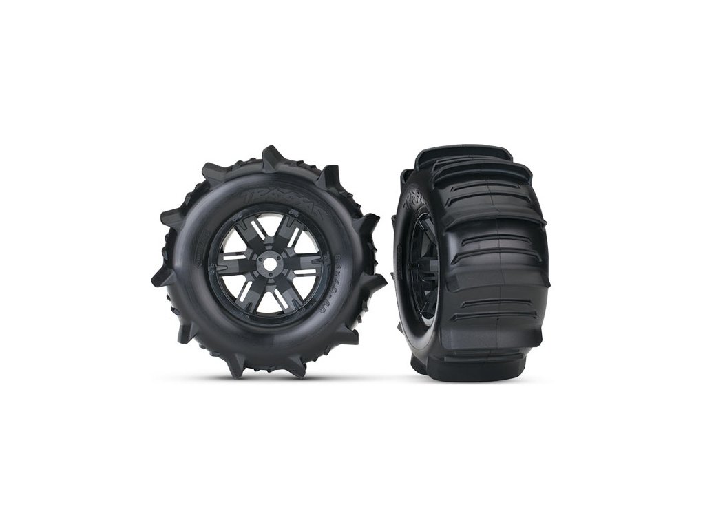 Kompletní kola pro model X-Maxx. Černé disky s lopatkovými pneumatikami (2 ks v balení). Paddle tires-lopatkové pneumatiky jsou vhodné do písku, sněhu nebo pro jízdu po vodní hladině.